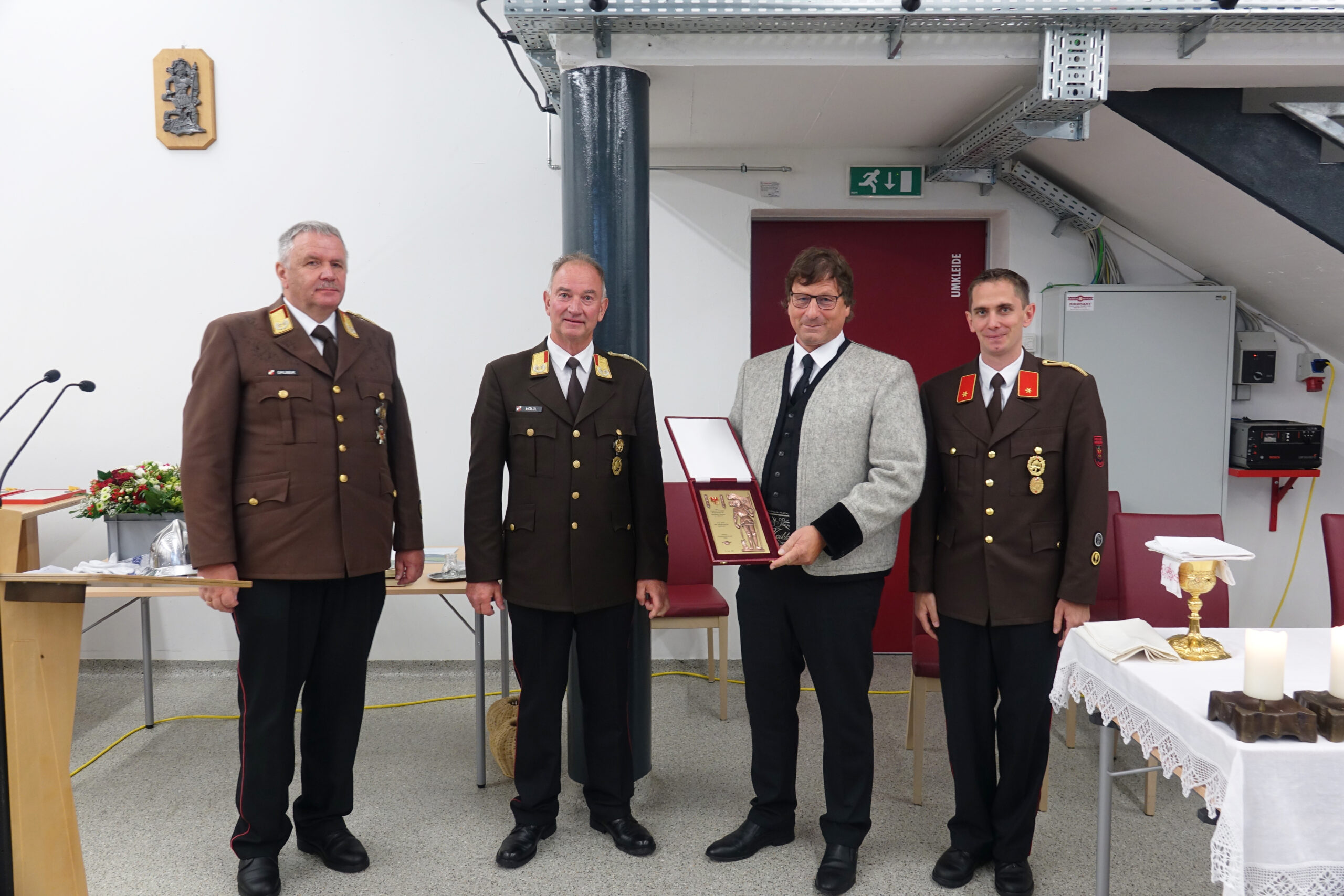 Nach dem Einmarsch und landesüblichen Empfang, welcher von der Bundesmusikkapelle Ramsau umrahmt wurde, begab sich der Festzug wetterbedingt in das Feuerwehrhaus. Hochwürden Dekan Ignaz Steinwender zelebrierte die Messe, danach folgte wohl der Höhepunkt des Festaktes: Die Segnung der neuen Drehleiter mit der stolzen Fahrzeugpatin Dani Wierer. Auch wurden Angelobungen durchgeführt und verdiente Mitglieder befördert. Bürgermeister Fritz Steiner erhielt vom Landesfeuerwehrkommando für seine Verdienste in der Gemeinde die Florianiplakette in Bronze.