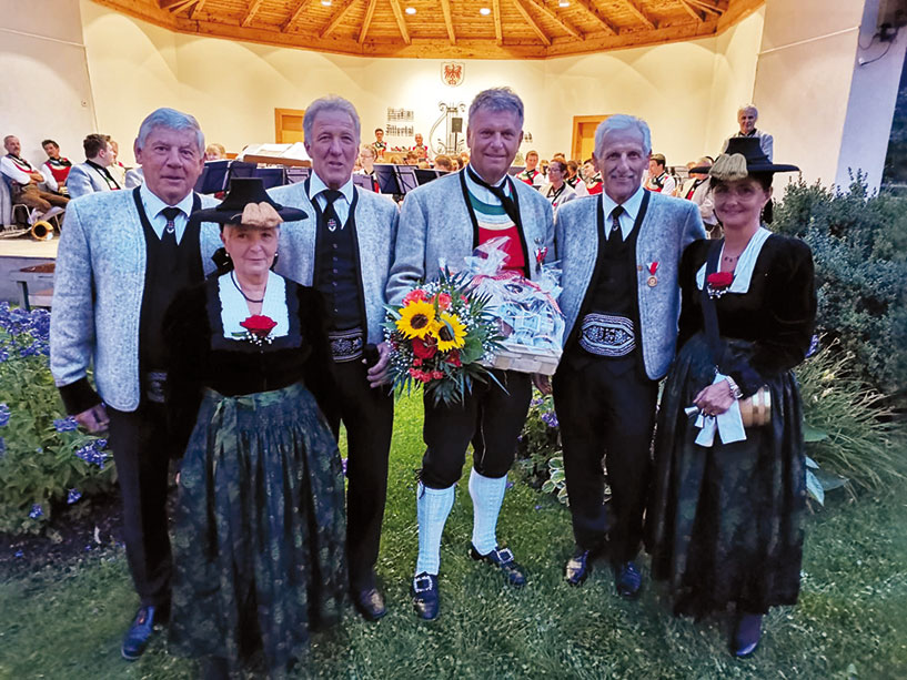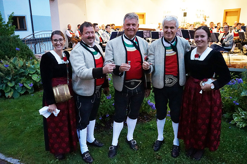 Neben den Auszeichnungen gab es noch einen weiteren Grund zum Feiern: Bgm. Franz Hauser (Schwendau), der auch als Obmann des Blasmusikverbandes Zillertaler fungiert, wurde am 27. Juli 60. Da war es nur folgerichtig, dass man ihm beim darauffolgenden Platzkonzert recht herzlich gratulierte. Im Bild mit Obmann Christian Sporer und Kapellmeister Helmut Brugger sowie den beiden Marketenderinnen Julia & Theresa. (1)