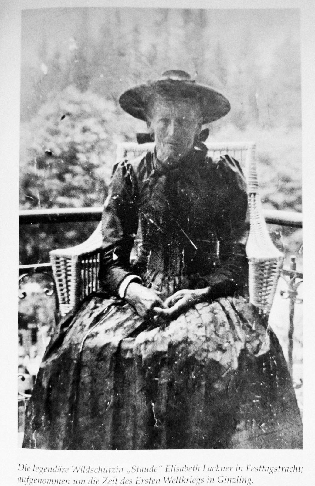 Die legendäre Wildschützin „Staude“ Elisabeth Lackner in Festtagstracht; aufgenommen um die Zeit des Ersten Weltkriegs in Ginzling.
