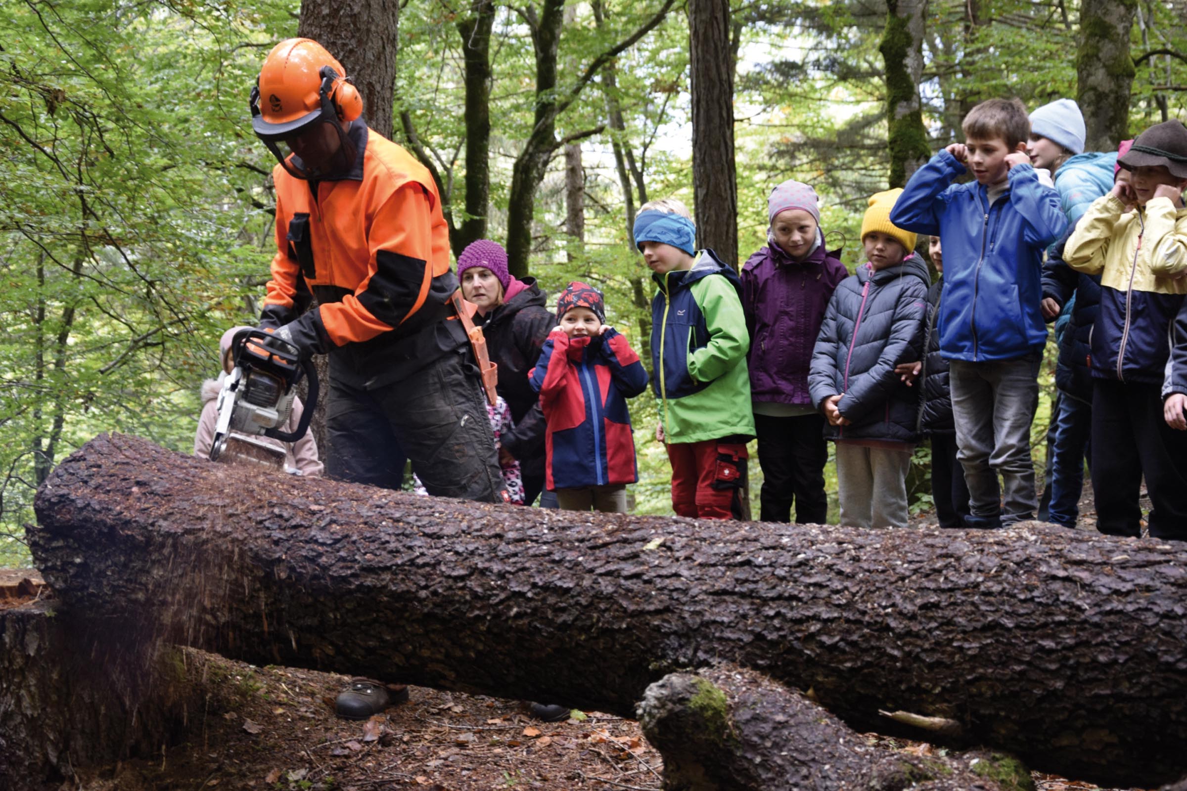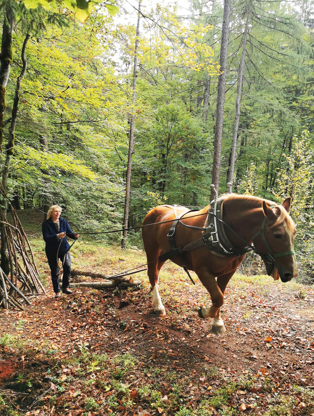 geht nach links, rechts, zurück und bleibt auf Kommando stehen. „Dies gelingt nur durch eine gute Ausbildung und jahrelange gemeinsame Arbeit“, berichtet Kirchmair und erklärt den SchülerInnen, dass sein 800 kg schweres Pferd bis zu 400 kg Holz aus dem Wald ziehen kann, ohne dabei die oft sensiblen Böden zu verletzen.
