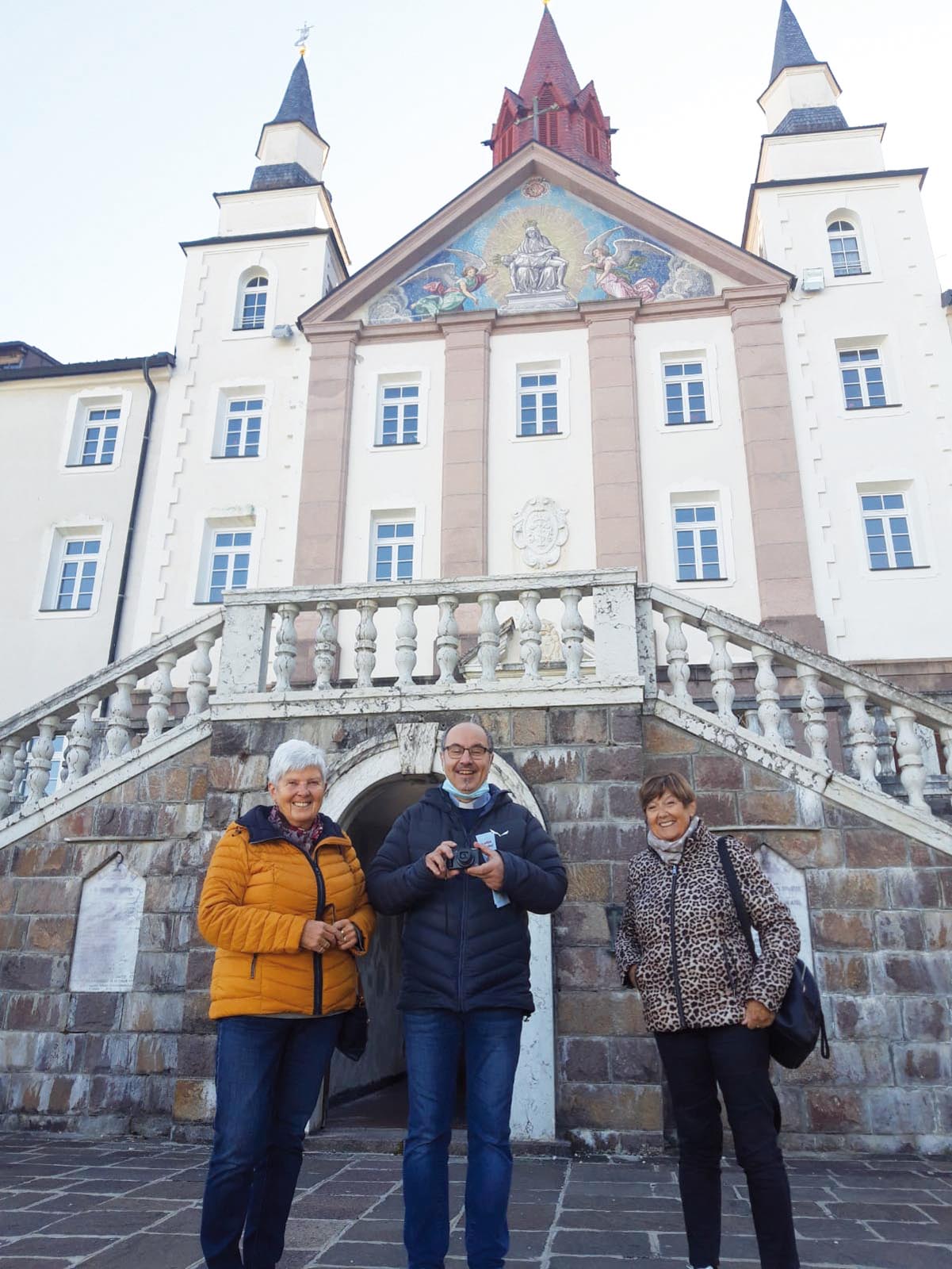 Der letzte Tag unserer Herbstreise wurde mit Spannung erwartet. Durch das romantische Eggental führte unsere Fahrt nach „Maria Weißenstein“, zu Südtirols bedeutendstem Wallfahrtsort, südöstlich von Bozen auf 1.520 Meter Höhe auf dem Reggelberg in der Nähe von Petersberg. Die als Kapelle erbaute und immer wieder erweiterte Basilika, auch genannt „Der Dom in den Dolomiten“, erhebt sich mächtig über das Eggental. Um 10.00 Uhr durften wir die Heilige Messe in der Wallfahrtskirche im angeschlossenen Servitenkloster von „Maria Weißenstein“, die Herr Pfarrer Mag. Jürgen Gradwohl für uns alle zu einem wahren Festgottesdienst werden ließ, erleben.