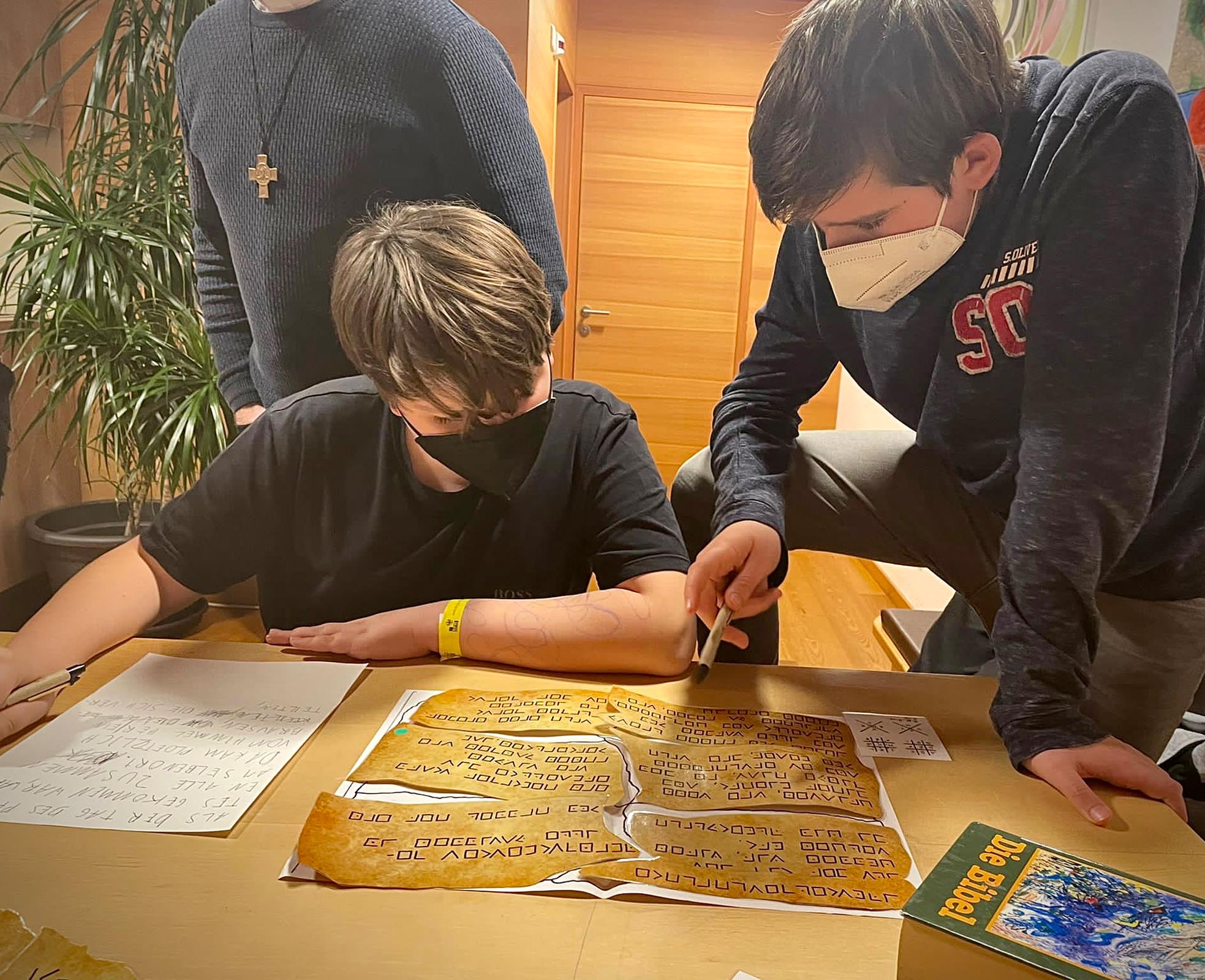 Um die Gemeinschaft ging es dann auch nach der Messe beim gemeinsamen Kochen. In der „Schnippeldisco“ wurden Gemüse und Kräuter geschnippelt, Dips angerührt und alles für‘s Essen vorbereitet. Nach den delikaten Wraps wurde es spannend! Es galt, gemeinsam aus dem Vatikan zu entkommen – natürlich nur beim Escape-Room-Spiel im Widum Aschau. Dabei wurden verschiedene Rätsel im Raum versteckt, die die Jugendlichen dann gemeinsam lösen mussten, um das Spiel zu beenden und den Forscher „Francesco“ zu helfen.