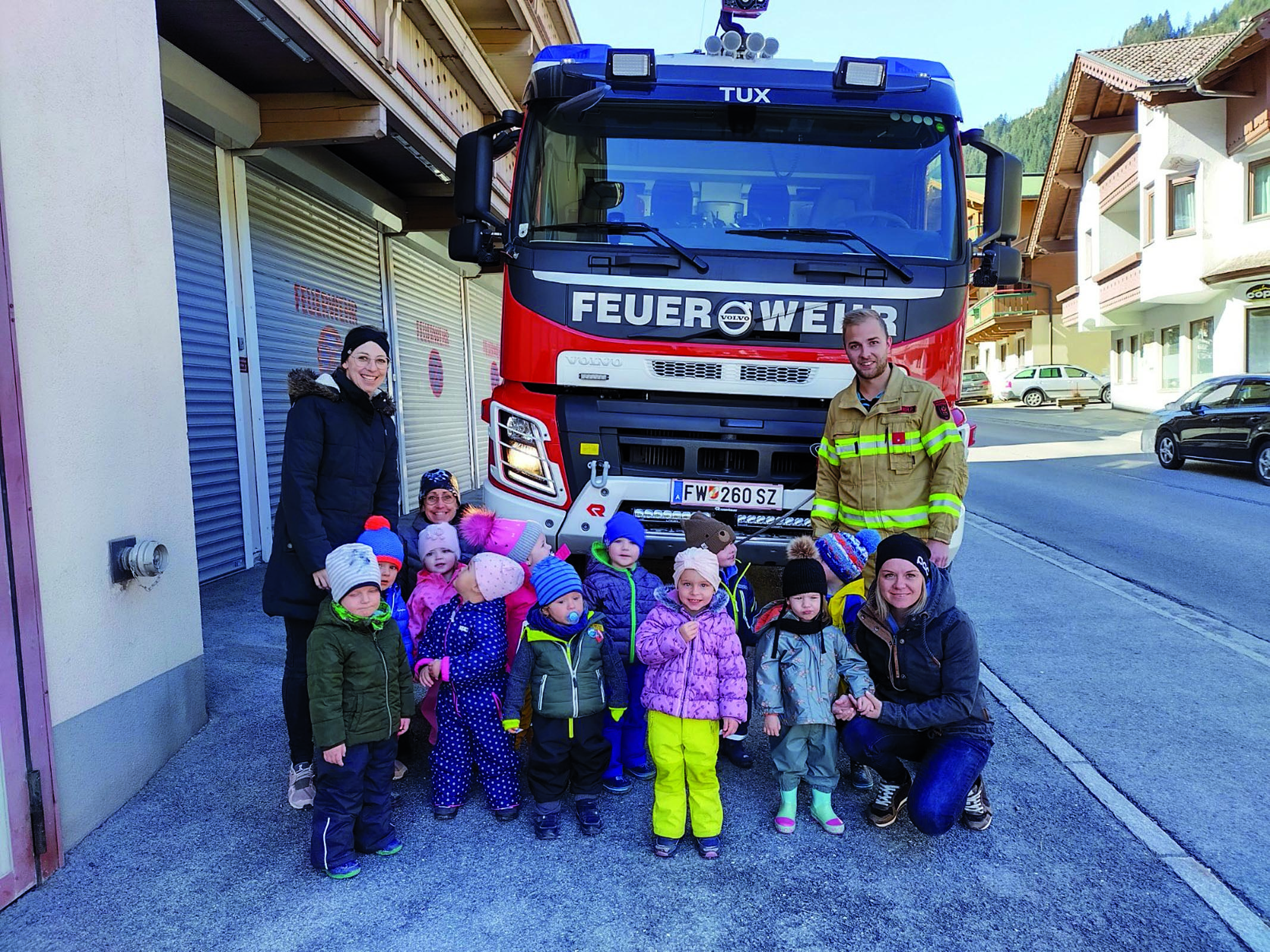 Alle Kinder hatten die Möglichkeit, mit dem großen Schlauch Wasser zu spritzen und als Highlight durften wir alle mit dem Feuerwehrauto eine Runde durch Tux fahren. Das war wirklich großartig. Danke Patrick, dass du dir für uns Zeit genommen hast.