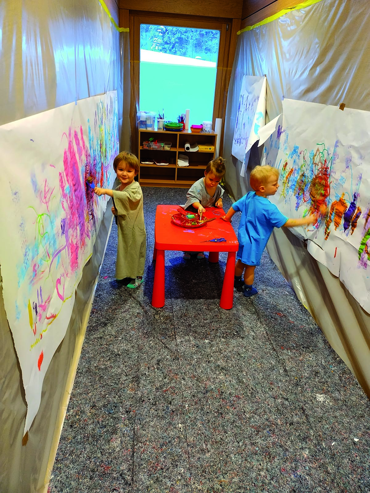 Im Jänner ist die Idee entstanden, aus unserem wenig genützten Gang ein Kreativatelier zu gestalten. Durch die großzügige Spende von Abdeck- und Abklebematerial der Malerei Fankhauser in Tux konnten wir unsere Idee toll umsetzen. Danke an Bettina und Wolfgang Fankhauser. Die Kinder haben eine riesen Freude am kreativen Werken.