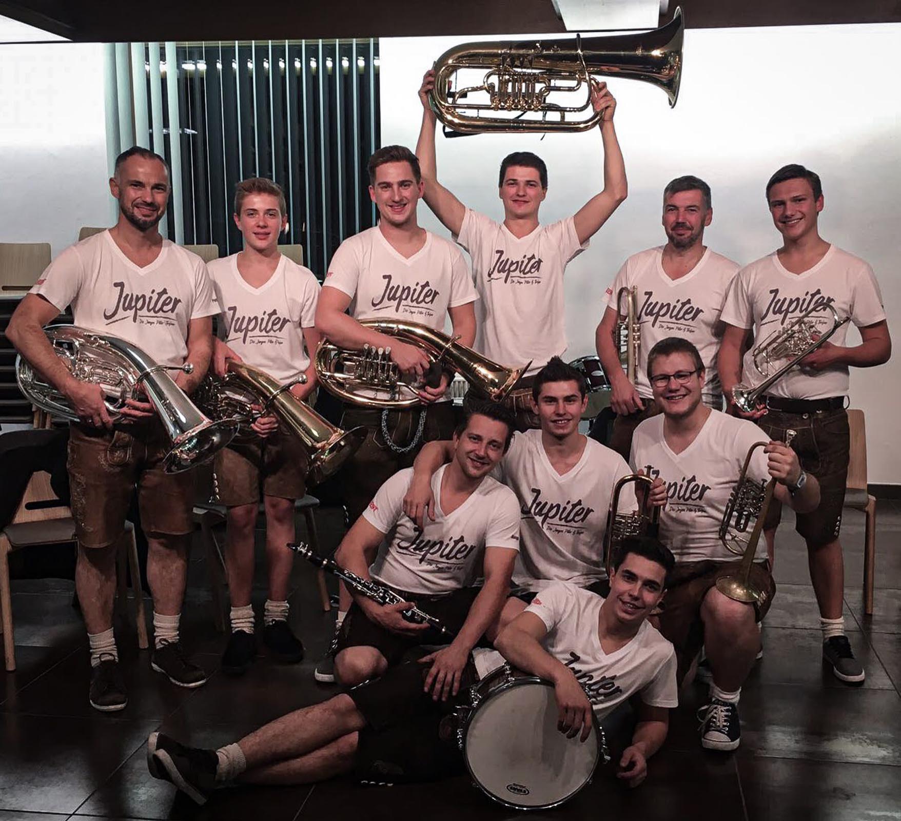 Zehn junge Musikanten und zwei Marketenderinnen der Musikkapellen Pill und Terfens. Jupiter steht für „Die jungen Piller & Terfner“.