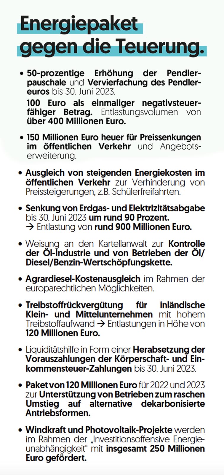 Neben den langfristig ausgelegten Strategien zur Entlastung auf unterschiedlichen Ebenen zeigte sich die Volkspartei in ihrer Regierungsverantwortung auch jetzt in dieser besonders heiklen Situation als rasch handlungsfähige und entscheidungsfreudige Problemlöserin. Mit dem Teuerungsausgleich von bis zu 300 Euro und dem Energiekostenausgleich von 150 Euro pro Haushalt wurden bereits im Jänner erste Maßnahmen präsentiert und auf den Weg gebracht – noch bevor wegen des Ukraine Krieges die Teuerung weiter anzog. Im März folgte das nächste Paket mit Schwerpunkt der Pendlerentlastung. Die Pendlerpauschale wurde um 50 % angehoben, der Pendlereuro auf das Vierfache erhöht. Insgesamt nimmt die Bunderegierung rund vier Milliarden Euro in die Hand, denn an der Krise soll der Staat nicht verdienen. Europaweit ist dies eines der schwersten Entlastungspakete im Kampf gegen die Teuerung. Allein durch das Anti-Teuerungspaket werden Menschen und Wirtschaft in Österreich um zwei Milliarden Euro entlastet.