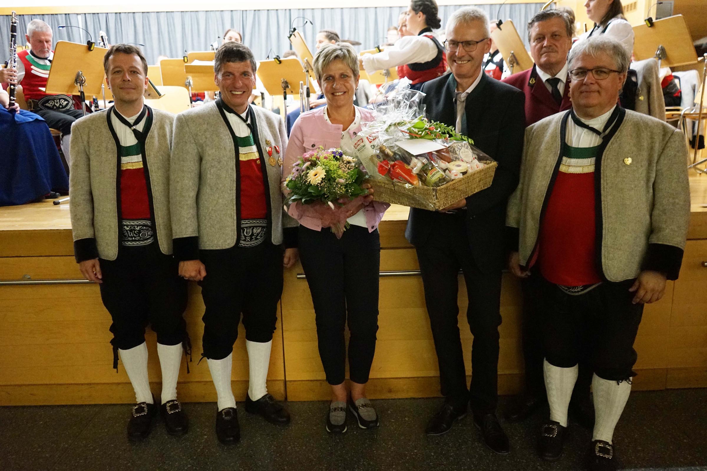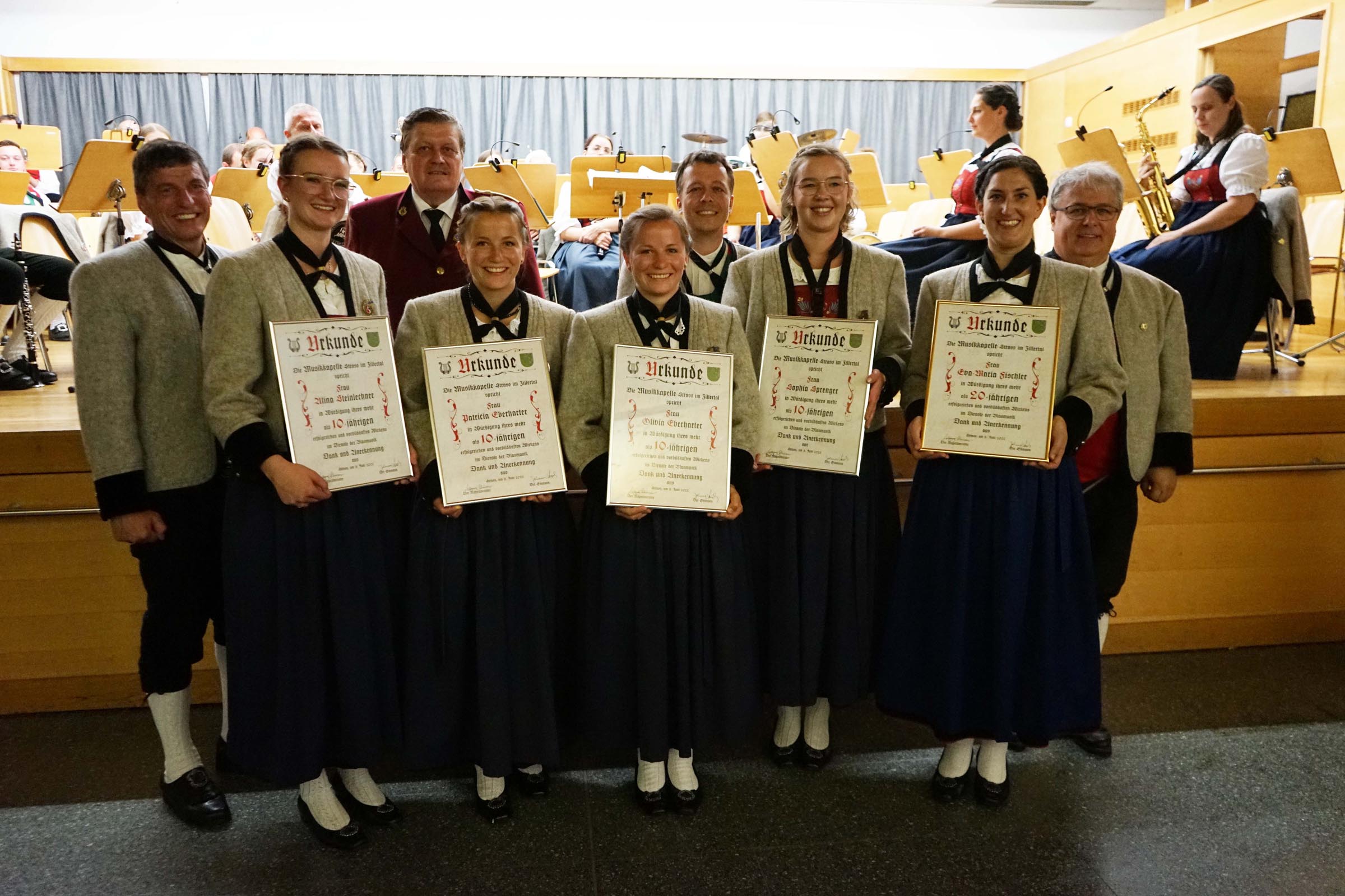 20-jährige- und Alina Steinlechner, die auch die Leitung des Jugendblasorchesters inne hat, Sophia Sprenger sowie Olivia und Patricia Eberharter für 10-jährige Mitgliedschaft geehrt. Peter Brunner erhielt das Ehrenzeichen in Bronze und Josef Kaltenhauser wurde als Musiker verabschiedet. Leistungsabzeichen gab es noch für Jonas Scheiterer, Johanna Schnirzer und Miriam Schöpf.