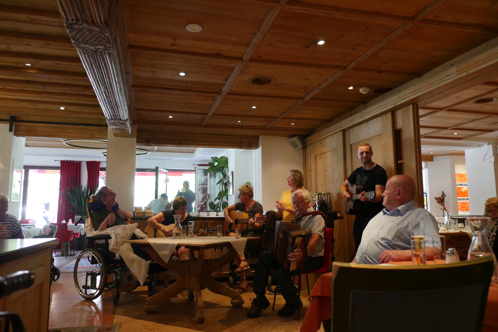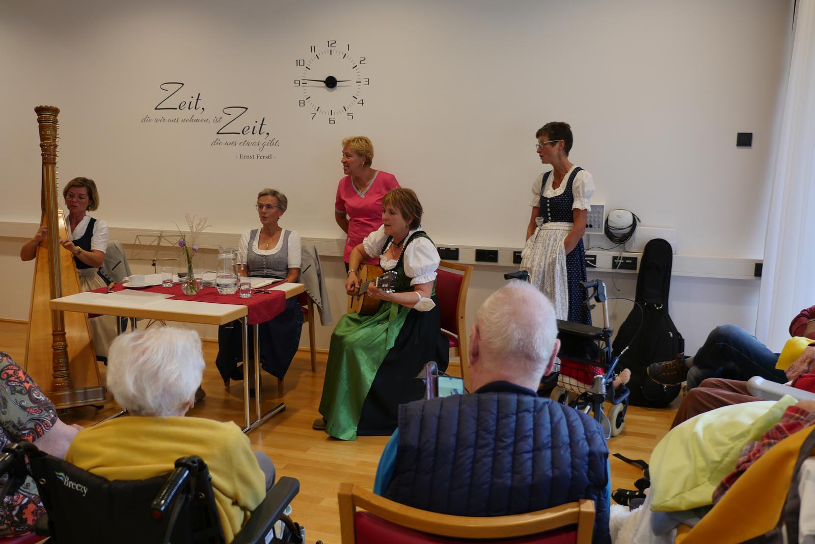 Immer wieder gerne wird bei uns gesungen und gelacht. So war es auch diesem Nachmittag, als wir Besuch aus Finkenberg bekommen haben. Der Finkenberger Dreigesang erwies uns die Ehre und spielte für die BewohnerInnen viele schöne bekannte alte Lieder. Der Festsaal war gerammelt voll und jeder horchte den schönen Stimmen. Mitarbeiterin Rosi und die ehrenamtliche treue Seele des Hauses Angela Plank ließen es sich nicht nehmen und haben ebenfalls gemeinsam mit den drei Finkenbergerinnen einige Lieder gesungen.