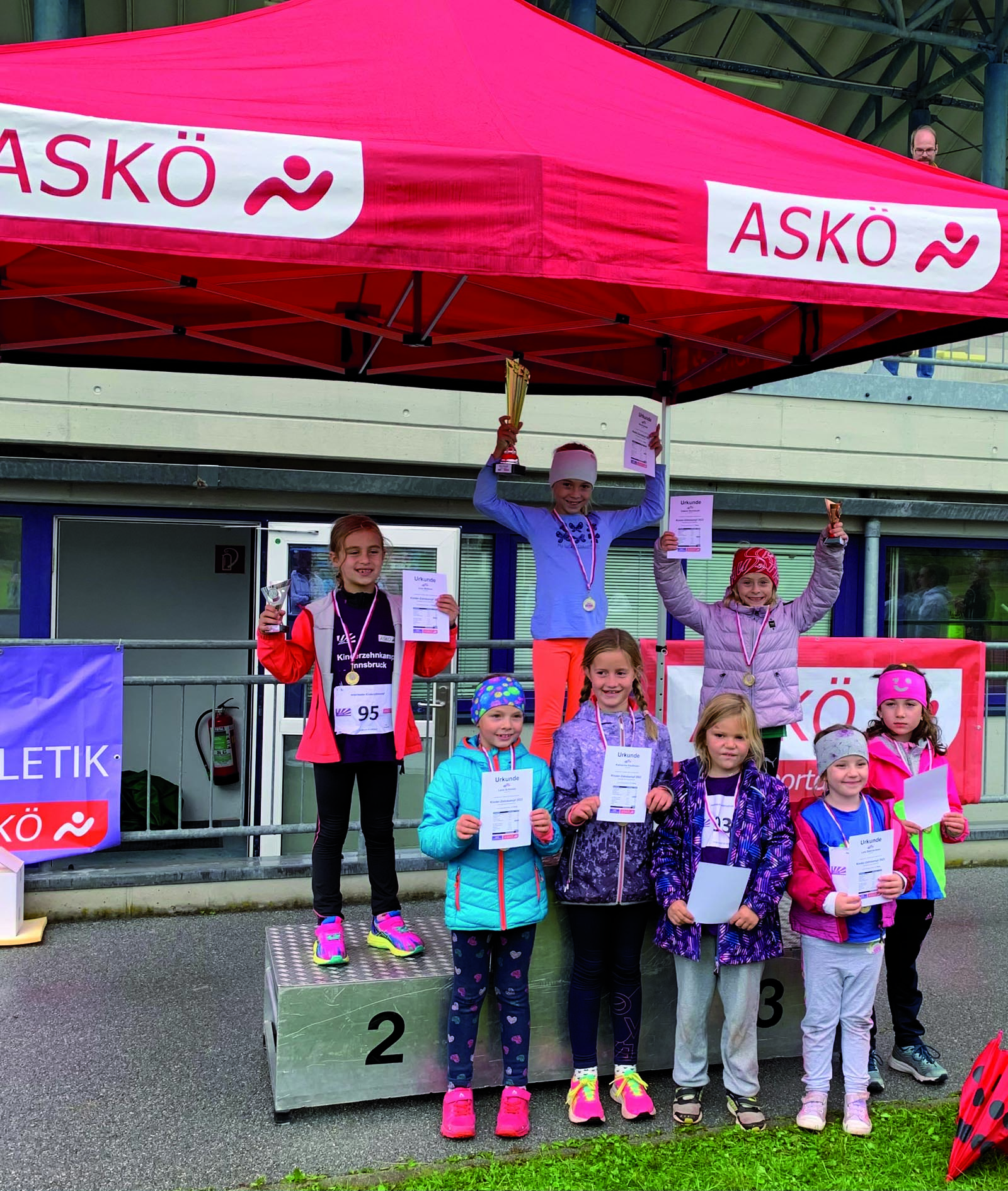 Am vergangenen Wochenende durfte Matthäus seine sportliche Begeisterung mit seinen Geschwistern Vincent (Jg. 2010) und Valerie (Jg. 2016) teilen, die ihm in Ausdauer und Disziplin nicht viel nachstellten. Der Innsbrucker Athletiksportclub veranstaltete bereits zum 18. Mal den Jedermann-Kinderzehnkampf. Der Auftakt der Disziplin begann mit 50m Hürden, sodann Weit, Vortex, Stabhoch, 10m Sprint fliegend, Ringwerfen, Hoch, Shuttle Lauf und Ballwerfen. Der Kinder-10-Kampf endete mit dem 800m Lauf. Unter dem Motto „Einer für alle, alle für einen“ freuten sich alle drei Athleten über Pokal, Medaille und Urkunde und die rundum gelungene Ganztagesveranstaltung. Wir gratulieren herzlich!