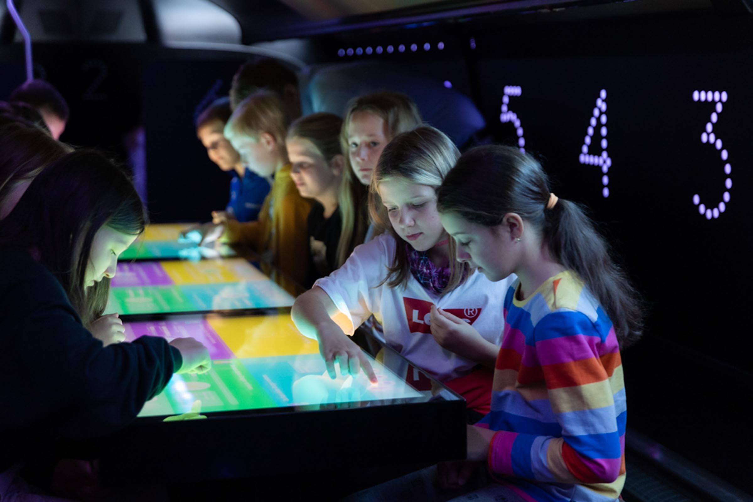 Der Innenraum dieses Buses ist mit interaktiven High-Tech-Stationen ausgestattet, an den die Schüler in Gruppen rund um das Thema Finanzen arbeiten durften.