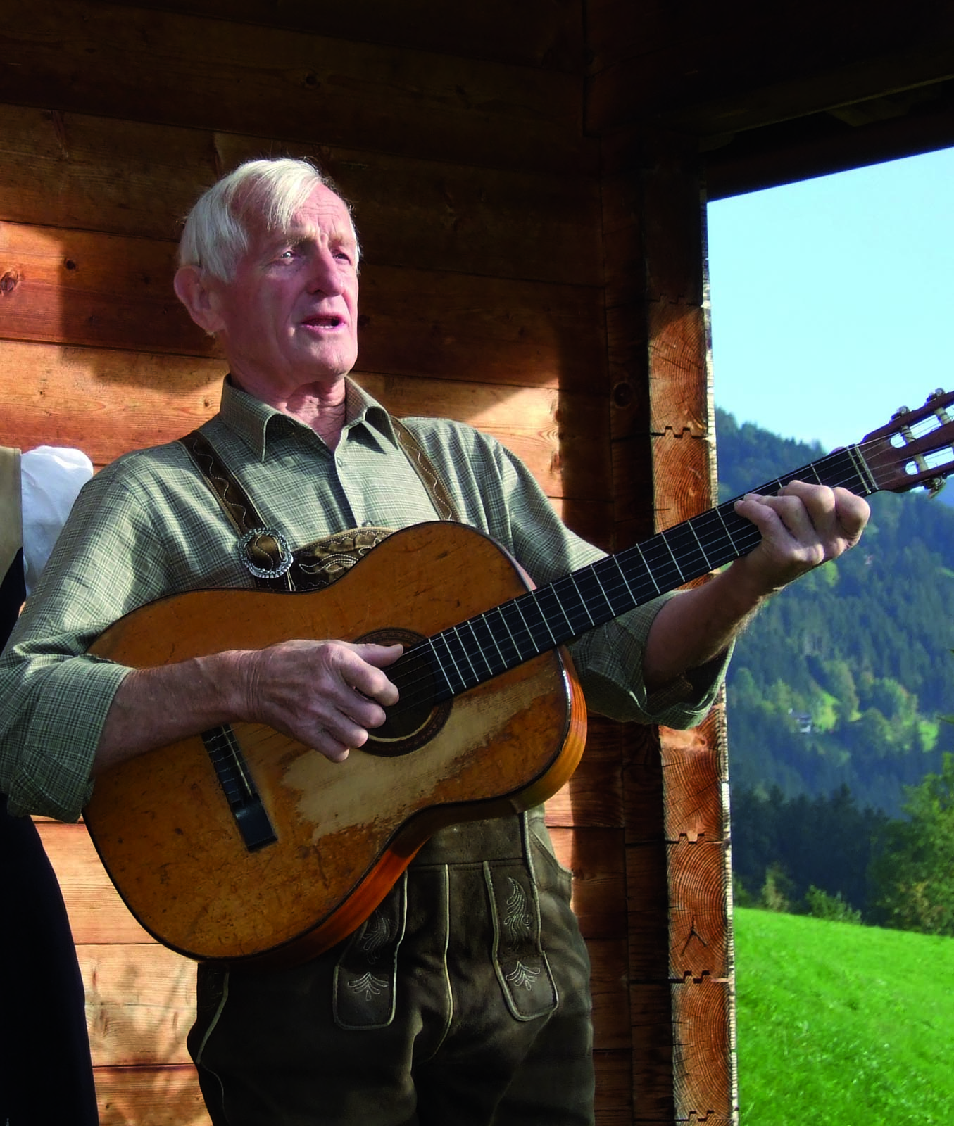 Vom Holzschlag her – die Händ no miad – hat er am Abend – noch fröhlich musiziert – mit seinen Töchtern – glasklar und fein – s‘kann nur der Klang – von Tuxer Machtlei sein – bis heute – bleibt er mir Idol – es gratuliert – die Musikantenwelt – und s‘ganze Land Tirol –