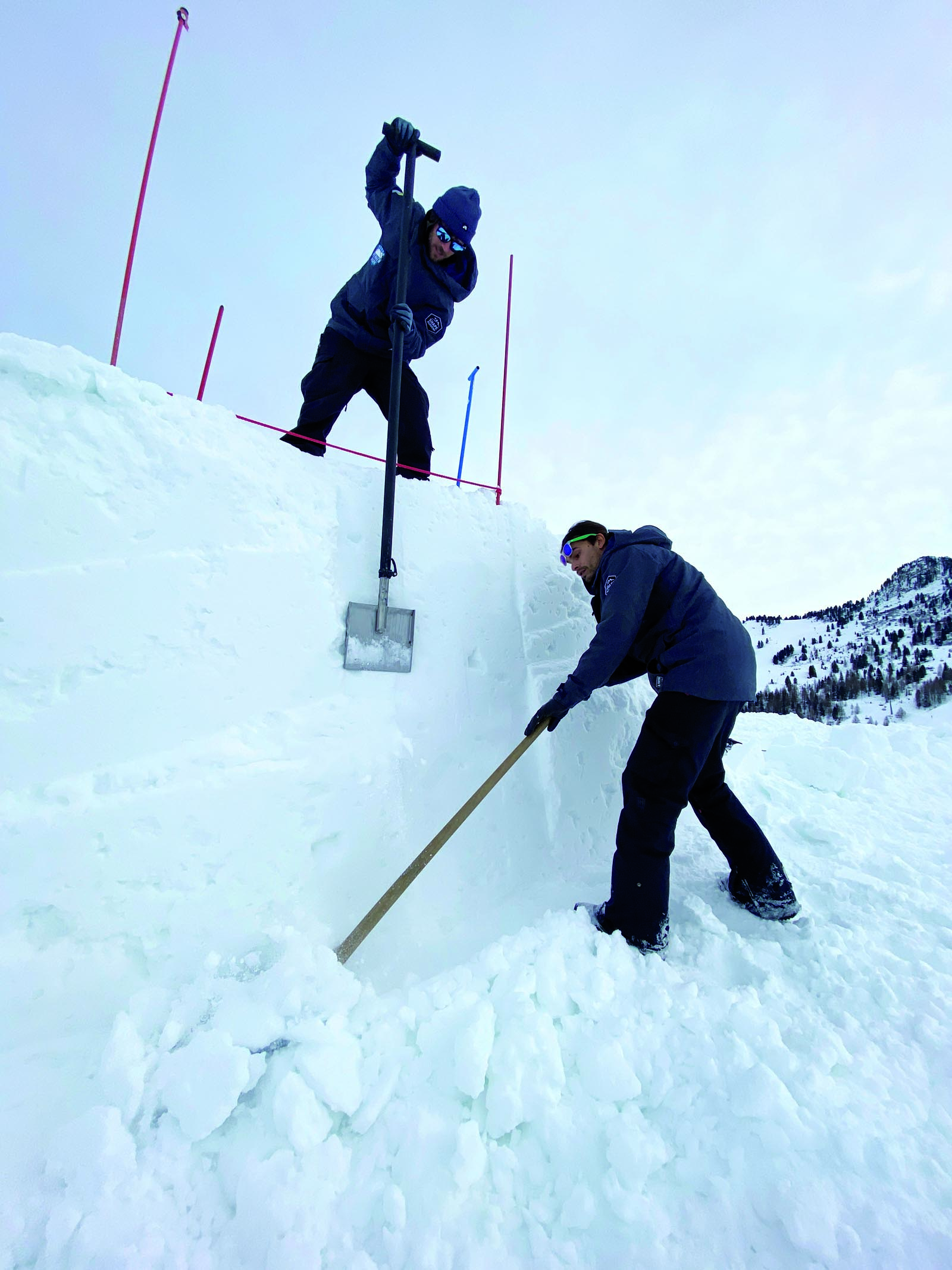 Stefan: „Durch die 3D-Daten kann die Suche nach der perfekten Länge des Anlaufes oder des richtigen Winkels der Kicker abgekürzt werden. Wir können von Beginn an einen optimalen Standard vom Park herstellen. Die Pistenbullys erledigen hier die Grobarbeiten. Die Feinheiten und Qualität, die dann den gewissen Unterschied machen, stellen aber die Shaper (engl: to shape, dt: in Form bringen) her. Die Shaper bringen den Snowpark in die gewünschte Form, sorgen für die Detailarbeiten am Element, bearbeiten den Absprung, beseitigen kleinere Löcher und Unebenheiten. Wenn alles passt, wird die Anlage jeden Morgen beim Anlagencheck freigegeben.“