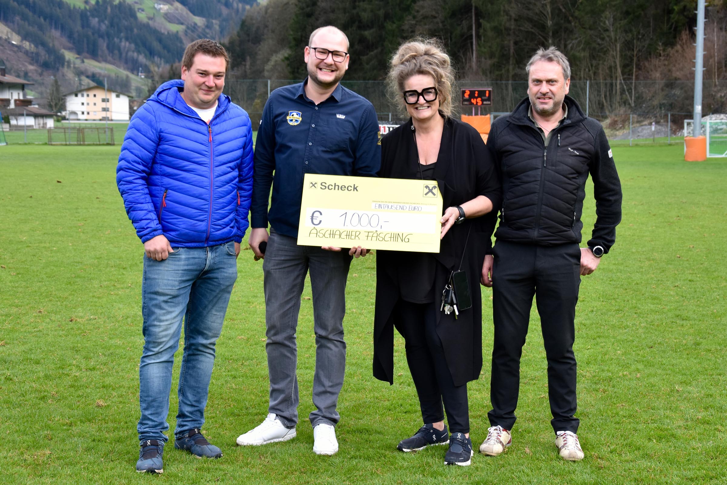 In einer großzügigen Geste haben die beiden Siegervereine beschlossen, ihre gewonnenen Preise dem Verein „Zillertaler helfen Zillertaler“ zu spenden. Der FC Aschau als Veranstalter hat die Summe aufgerundet, sodass insgesamt 1.000,- Euro zusammengekommen sind. Der Spendenscheck wurde beim ersten Heimspiel der Rückrunde von Patrick Taxacher (FC Aschau), Manuel Steinwender (Brauchtumsgruppe Kaltenbach) und Josef Holaus (HC Distelberg) an die Obfrau Theresia Rauch (Zillertaler helfen Zillertaler) übergeben.