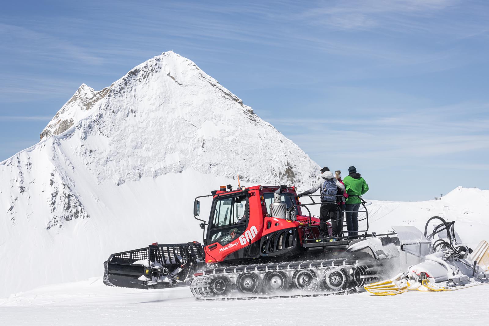 Am Plateau des Gletscherbus 3 kann man unter fachkundiger Anleitung ab 11.00 Uhr einmal selbst einen 600 PS starken Pistenbully lenken und das Zusammenspiel von Technik und Kraft auf Schnee spüren.