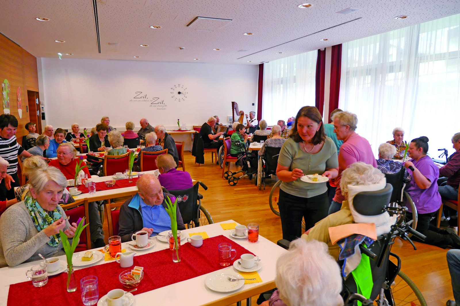 Ihre Nachbarinnen haben leckere Kuchen gebacken und ihre fleißigen Helferinnen, die mitgekommen sind, haben die BewohnerInnen vorzüglich bewirtet. Oberdrein gab es für jede Jubilarin und jeden Jubilar ein Geburtstags-Präsent.