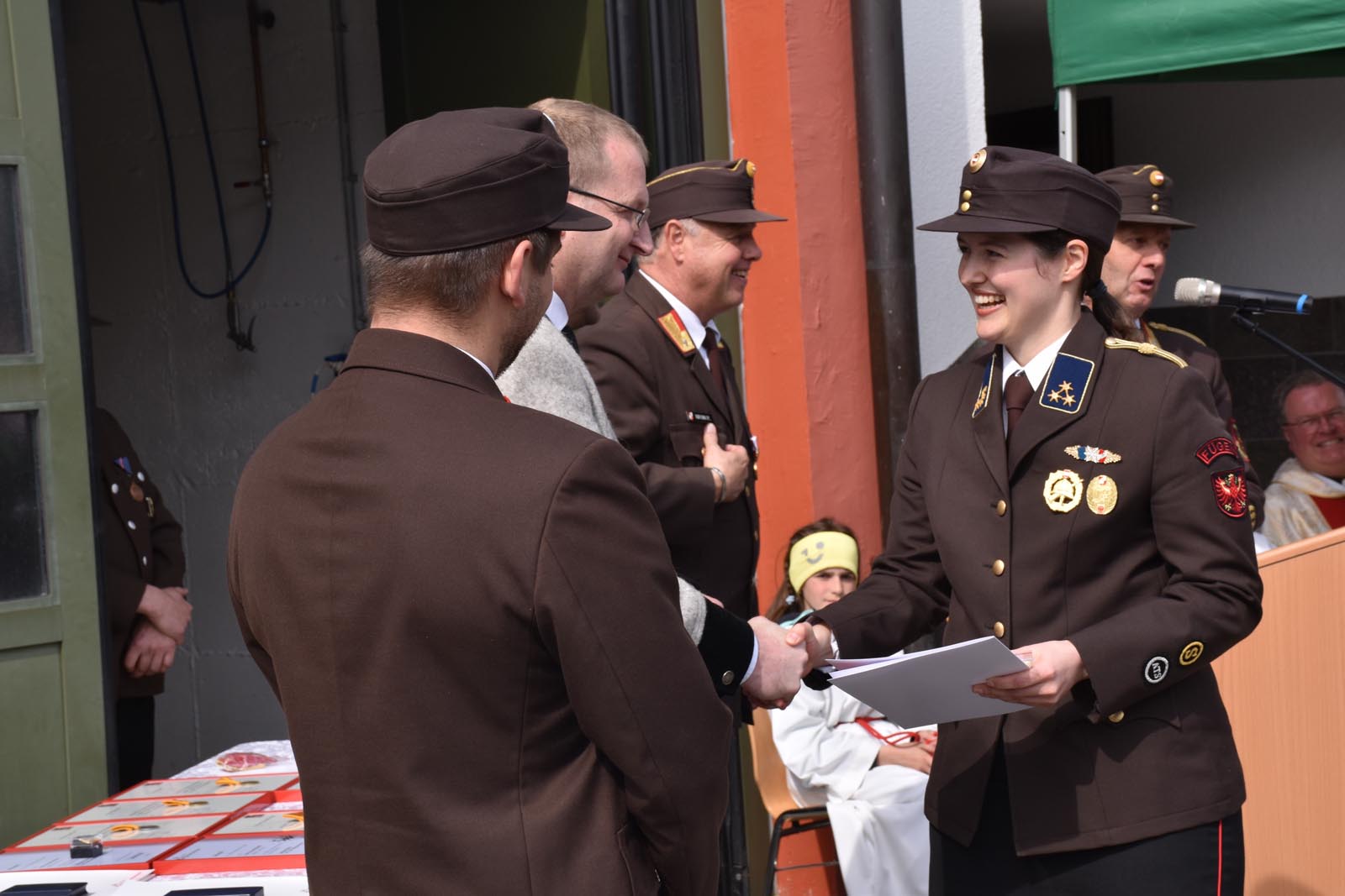 Oswald Huber und Mario Rieser für 25 Jahre, Werner Baumann und Christian Schwemberger für 40 Jahre, Alois Opbacher für 60 Jahre sowie Georg Sprenger für 70 Jahre imFeuerwehrdienst. Zudem konnten Ehrungen auf Bezirks-, Landes- und Bundesebene durchgeführt werden. Eine besonderer Beförderung war die Ernennung von Verena Haun zur Feuerwehrärztin.