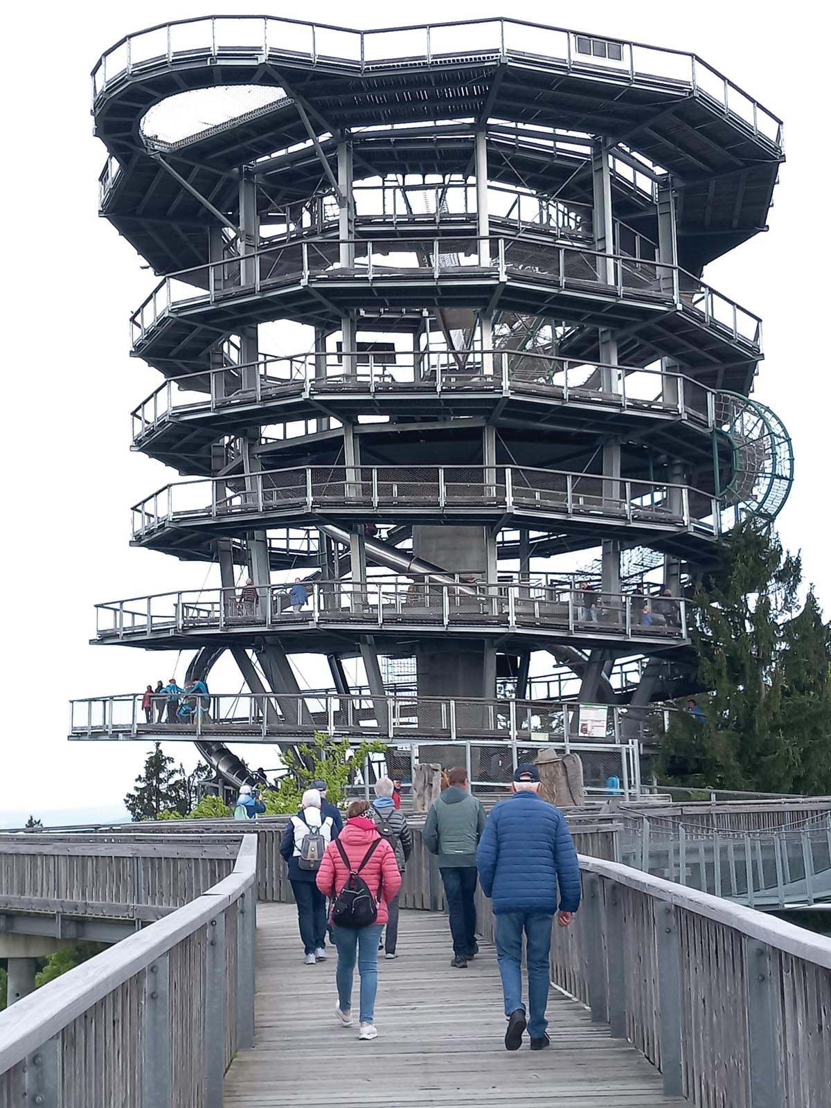 Dienstag, 16. Mai 2023: „Der Wipfel der Gefühle“, ein 52 m hoher Wald-Turm mit dem Wald-Wipfelweg, für Jung und Alt ein Erlebnis, leicht zu bewältigen, sogar barrierefrei. Der absolut spannende Pfad „Optische Phänomene“ zog so manchen in seinen Bann, der Natur Erlebnis Pfad und weitere lehrreiche Attraktionen ließ die Zeit wie im Flug vergehen. Also ließen wir Maibrunn und St. Englmar hinter uns und steuerten die Stadt CHAM an. In der „Wasserwirtschaft“ an der Regen, einem durch die „Blaue Brücke“, einem markanten Bauwerk – Verbindung der Innenstadt mit dem Naherholungsgebiet „Quadfeldmühle“ -, erfreuten wir uns an der sehr guten Küche und dem gemütlichen Ambiente.