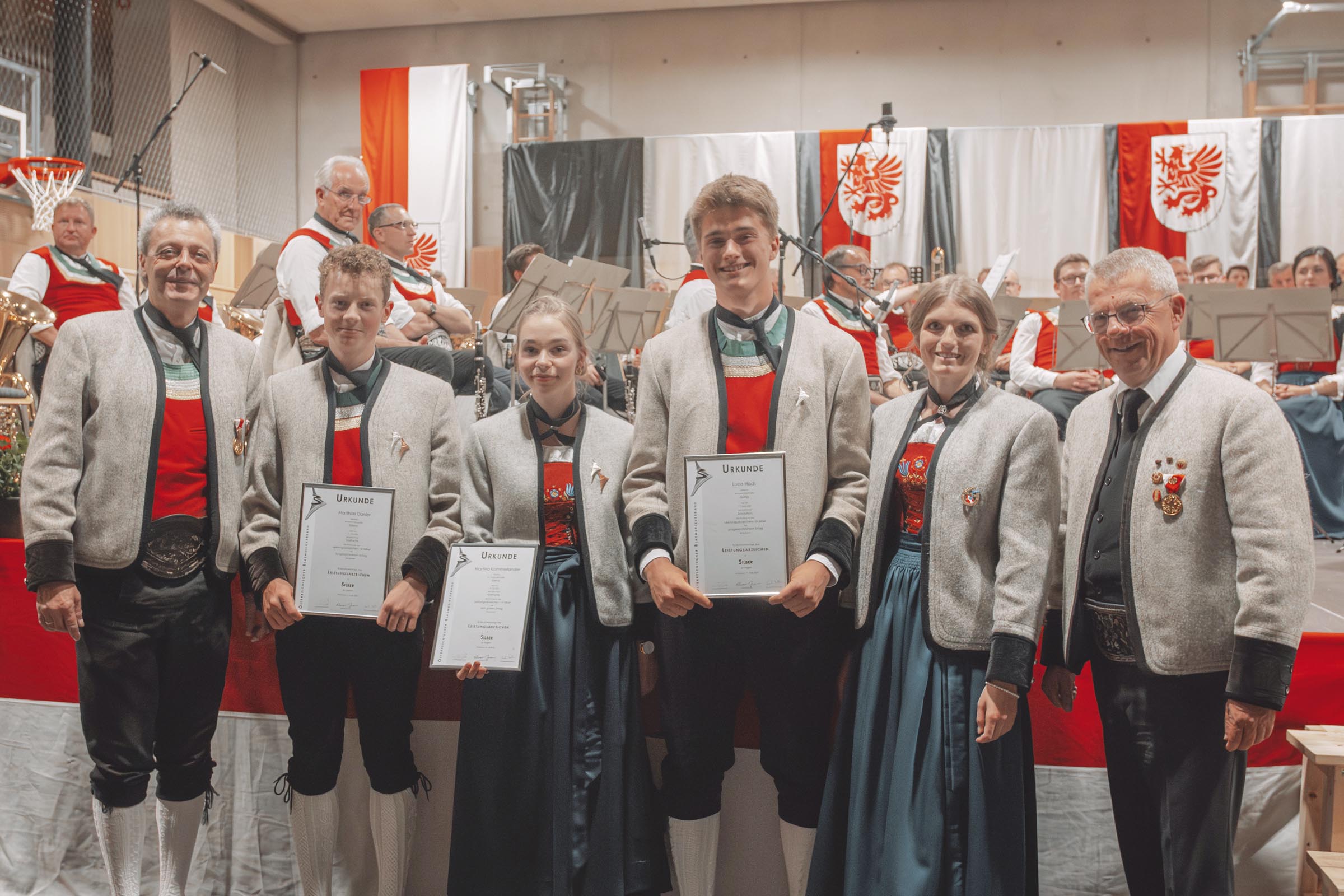Auch die Jungmusikanten erhielten ihre mit ausgezeichnetem Erfolg absolvierten Leistungsabzeichen. Überreicht wurden die Abzeichen vom Bezirksobmann Stv. Bgm. Robert Pramstrahler und Jugendreferentin Daniela Luxner.