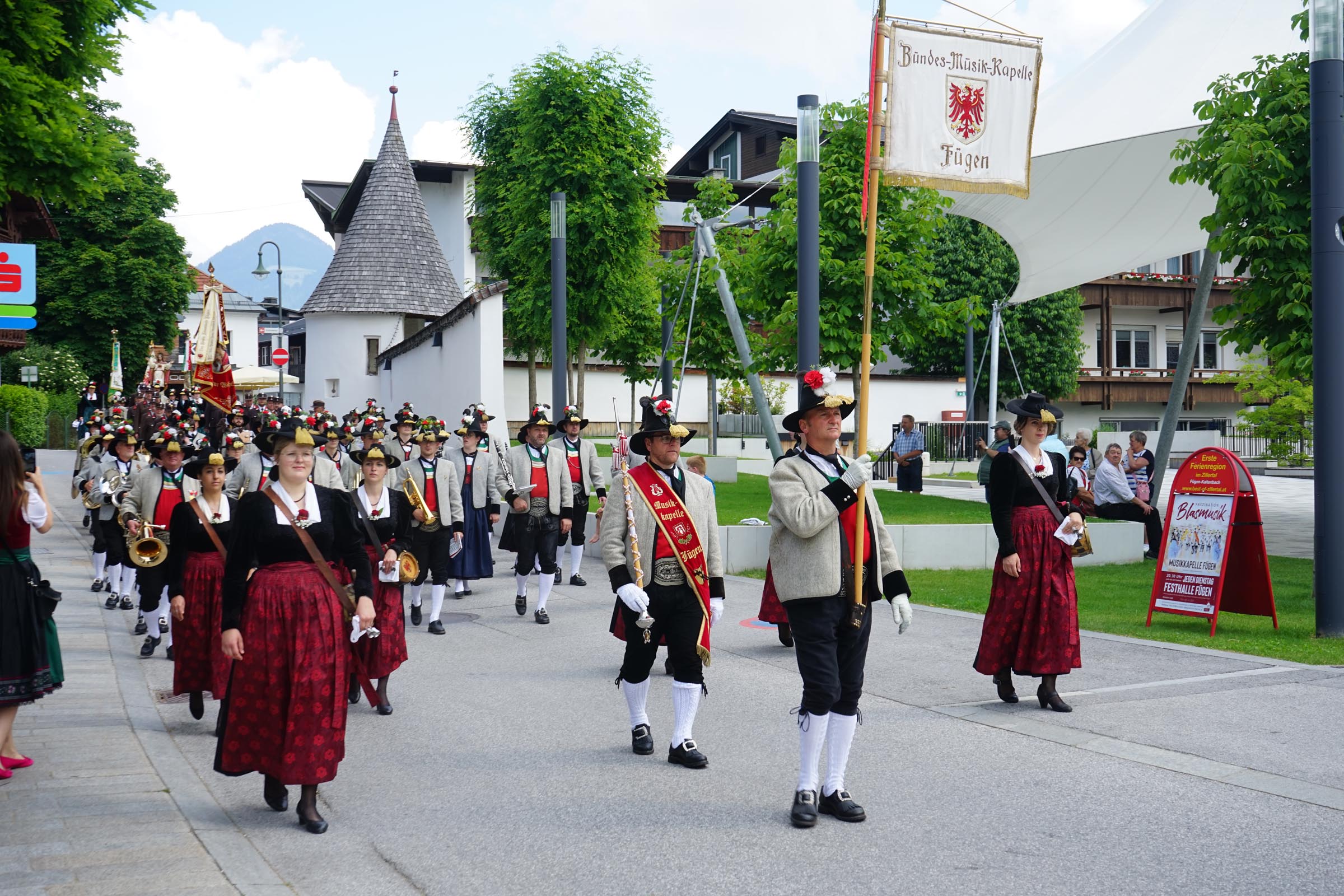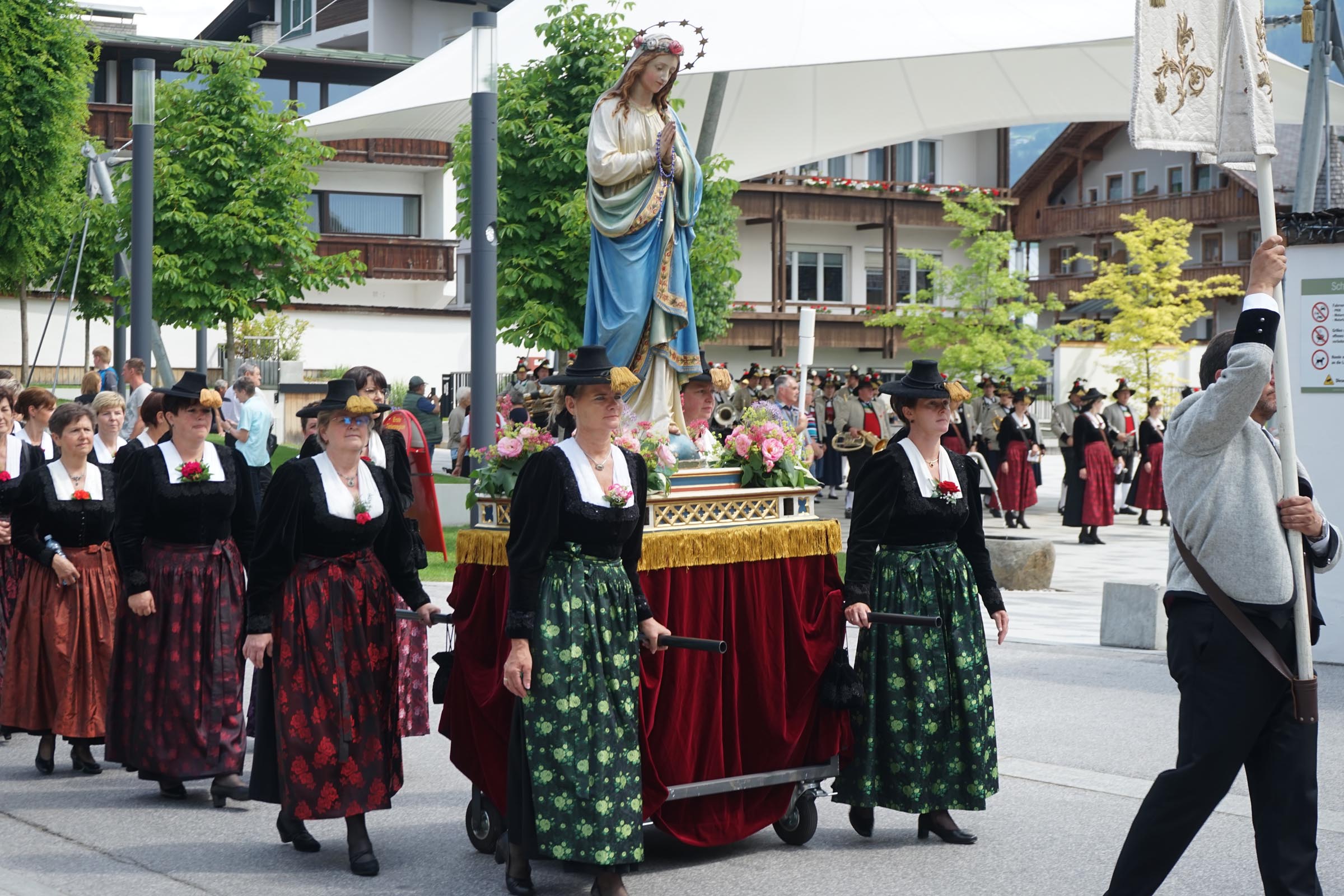 In Fügen wurde die Fronleichnamsprozession vom Donnerstag auf den Sonntag verlegt, was sich jedoch nicht nachteilig auf das Mittun der Bevölkerung auswirkte. Prozessionen sind bei uns noch immer sehr beliebt, auch dank der vielen Vereine, die sich dafür Zeit nehmen und so ihren Glauben öffentlich bekennen und bezeugen. Es ist auch sehr schön, wenn Vertreter des öffentlichen Lebens bei den Prozessionen mitgehen. Dieser Gang durch das Dorf ist mehr als nur Folklore! ah