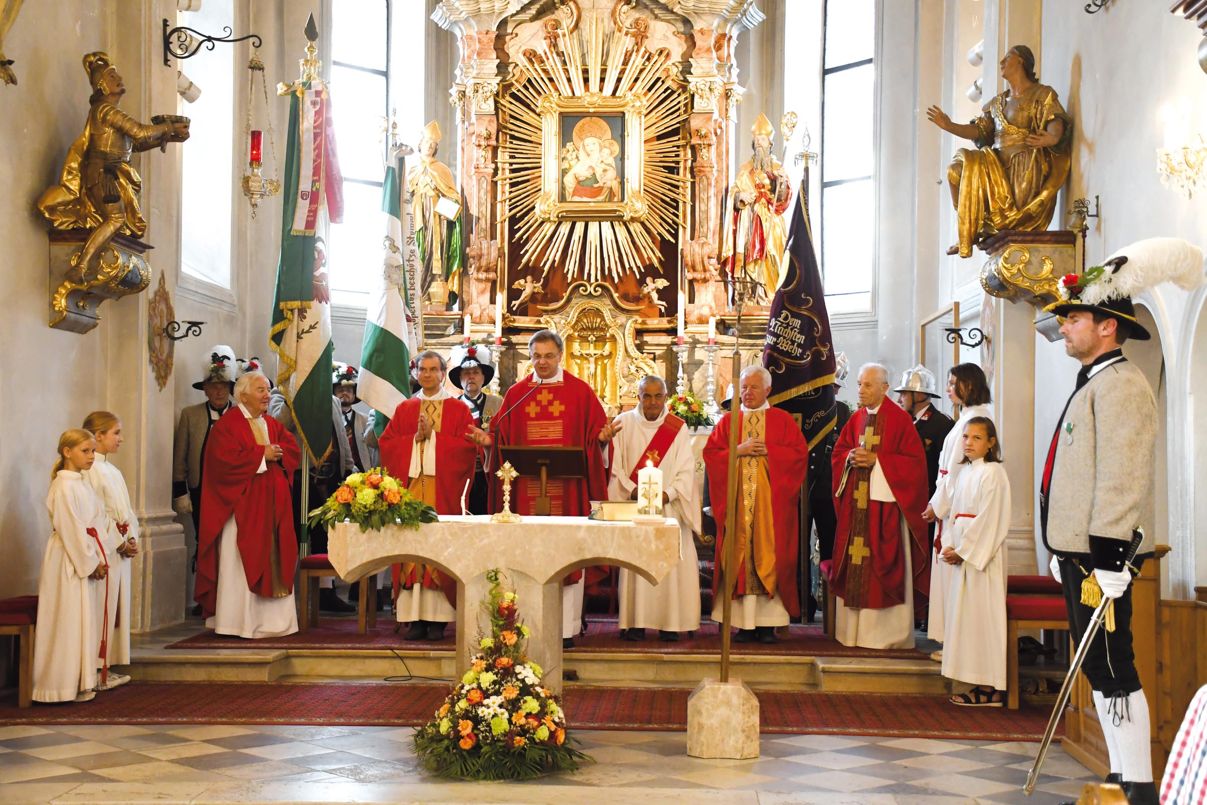 Zuerst fand in Hart der festliche Gottesdienst, musikalisch gestaltet vom Harter Chor und den Bläsern der BMK, statt. Anschließend konnten alle Abordnungen der Vereine und die Pfarrangehörigen vor dem Widum gratulieren und sich bei der Agape angeregt unterhalten. Die Volksschulkinder brachten ihm ein lustiges musikalisches Ständchen. Am nächsten Tag, dem Fest „Peter und Paul“, folgte der zweite Teil der Feierlichkeiten in Stumm. Dort konnte Pfarrer Proßegger mit mehreren Priesterkollegen die Hl. Messe zelebrieren, ebenfalls gestaltet vom Kirchenchor und den Bläsern. Am Ende des Gottesdienstes sangen ihm die Jungscharkinder ein feines Lied. Von beiden Pfarren erhielt er ein gemeinsames, wunderschönes Geschenk. Am Dorfplatz marschierten die Schützen und die Bundesmusikkapelle auf. Alle Institutionen waren gekommen, um ihrem beliebten Pfarrer die besten Glückwünsche zu überbringen. Auch hier konnte die Pfarrbevölkerung gratulieren und bei der Agape den Abend gesellig verbringen.