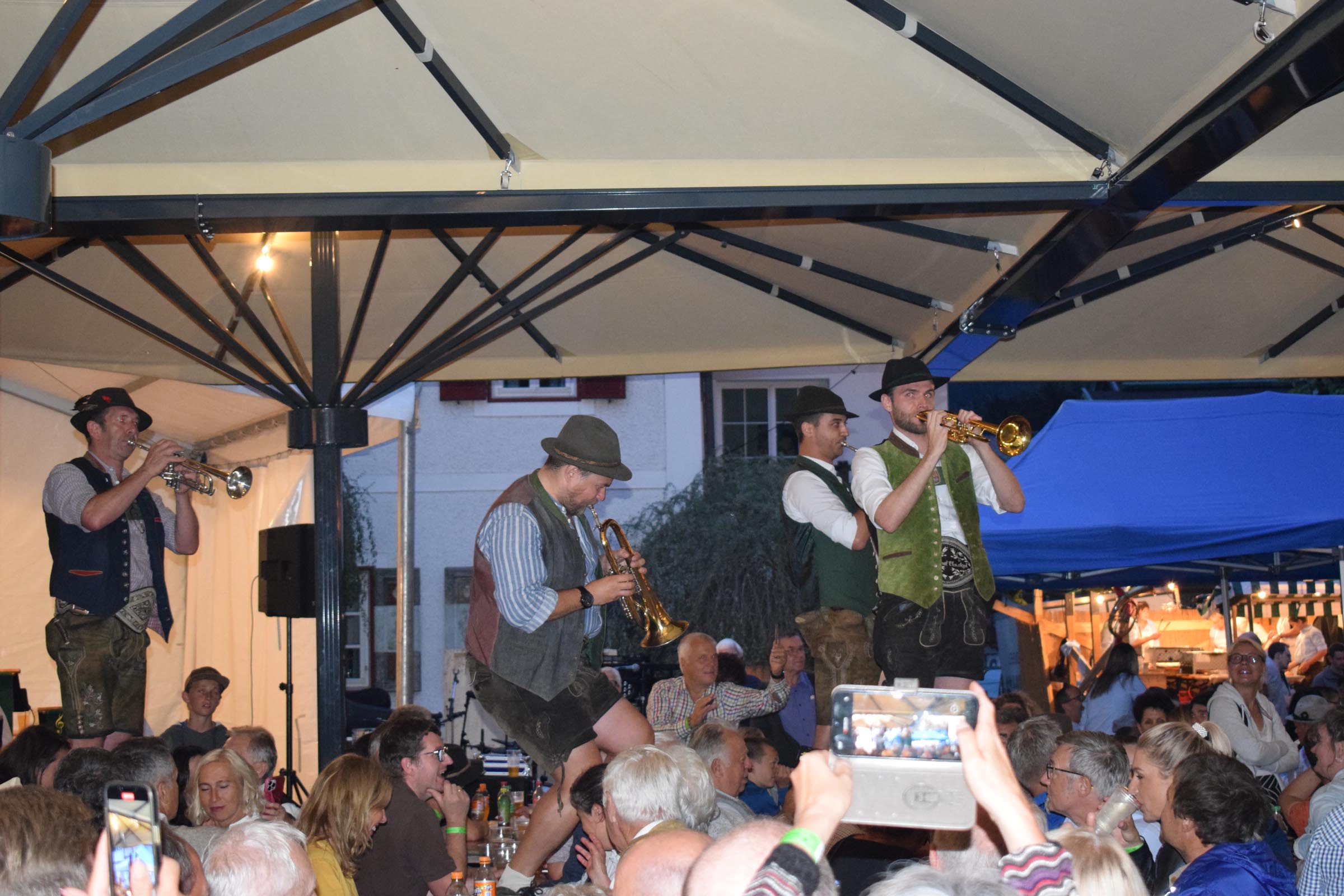 Nach gelungenem Bieranstich durch Bgm. Franz Kolb, unter Mithilfe von Nationalratsabgeordneten Franz Hörl, eröffnete die BMK Baumkirchen das Fest. Danach unterhielten DIE MÜHLBICHLER, gefolgt von HÖLLAWIND, die den Besuchern am Dorfplatz einheizten.