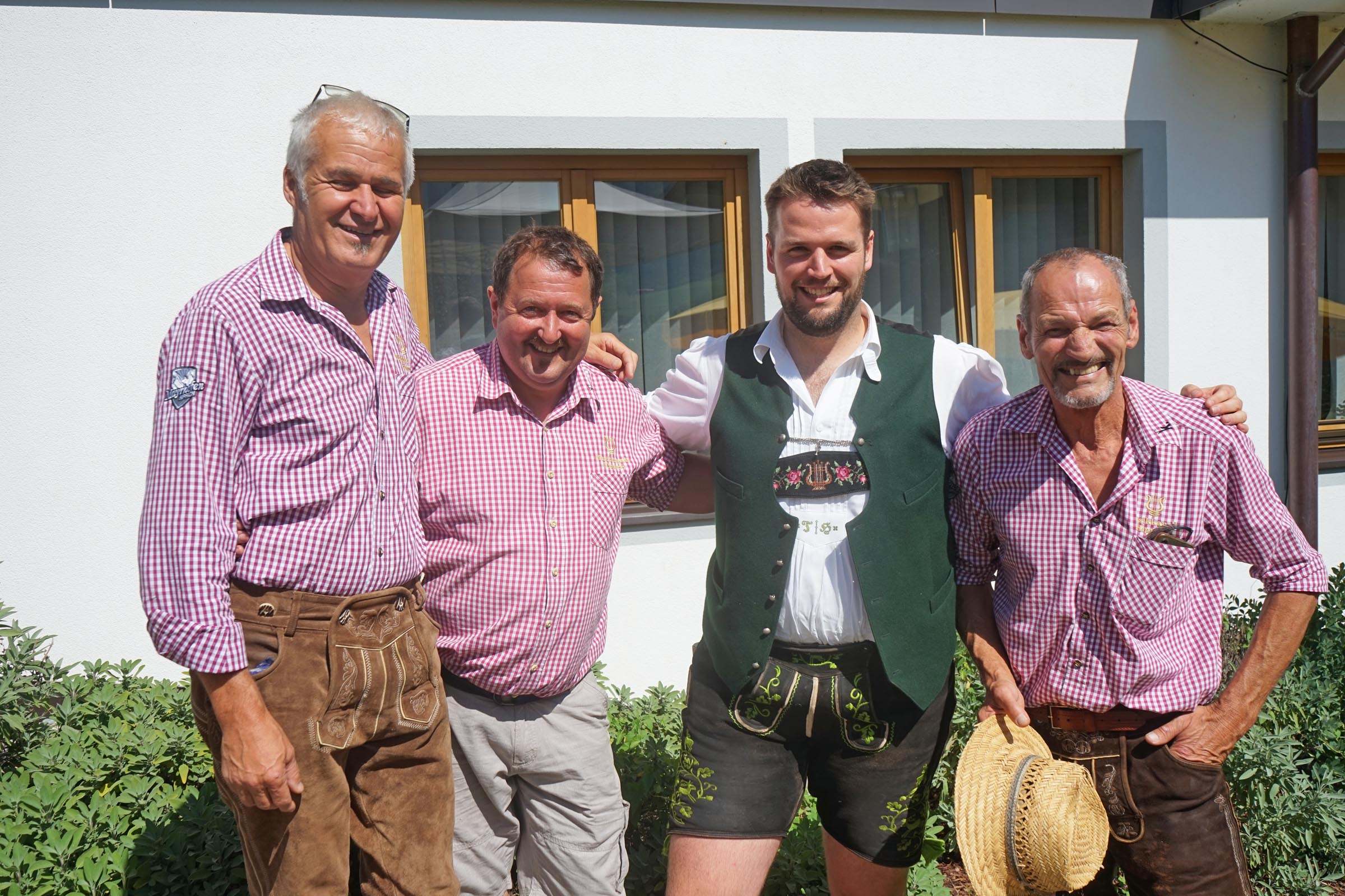 2) Kapellmeister Helmut Brugger, Obmann Christian Sporer und Fest-Organisator Martin Dengg mit dem Chef der Gruppe „Da Griabige Haufn“ Thomas Heimgreiter.