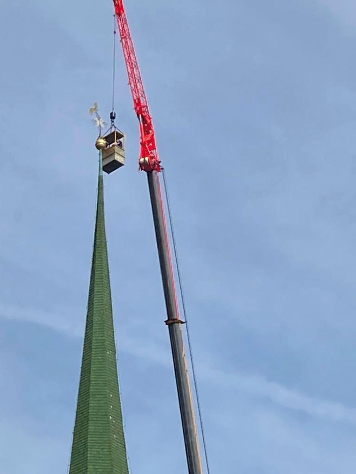 Kirchenratsobmann Josef Brindlinger hat sofort die bewährte Dachdeckerfirma Astner (Matthias Astner) verständigt und engagiert. Es folgte eine Besichtigung und dann die Planung und Koordination der Reparaturarbeiten des Turmes. Dabei zeigte sich, dass die Bereitstellung eines Spezialkranes erforderlich sein würde. Bürgermeister Pramstrahler sorgte schnell und unbürokratisch für alle behördlichen Notwendigkeiten.
