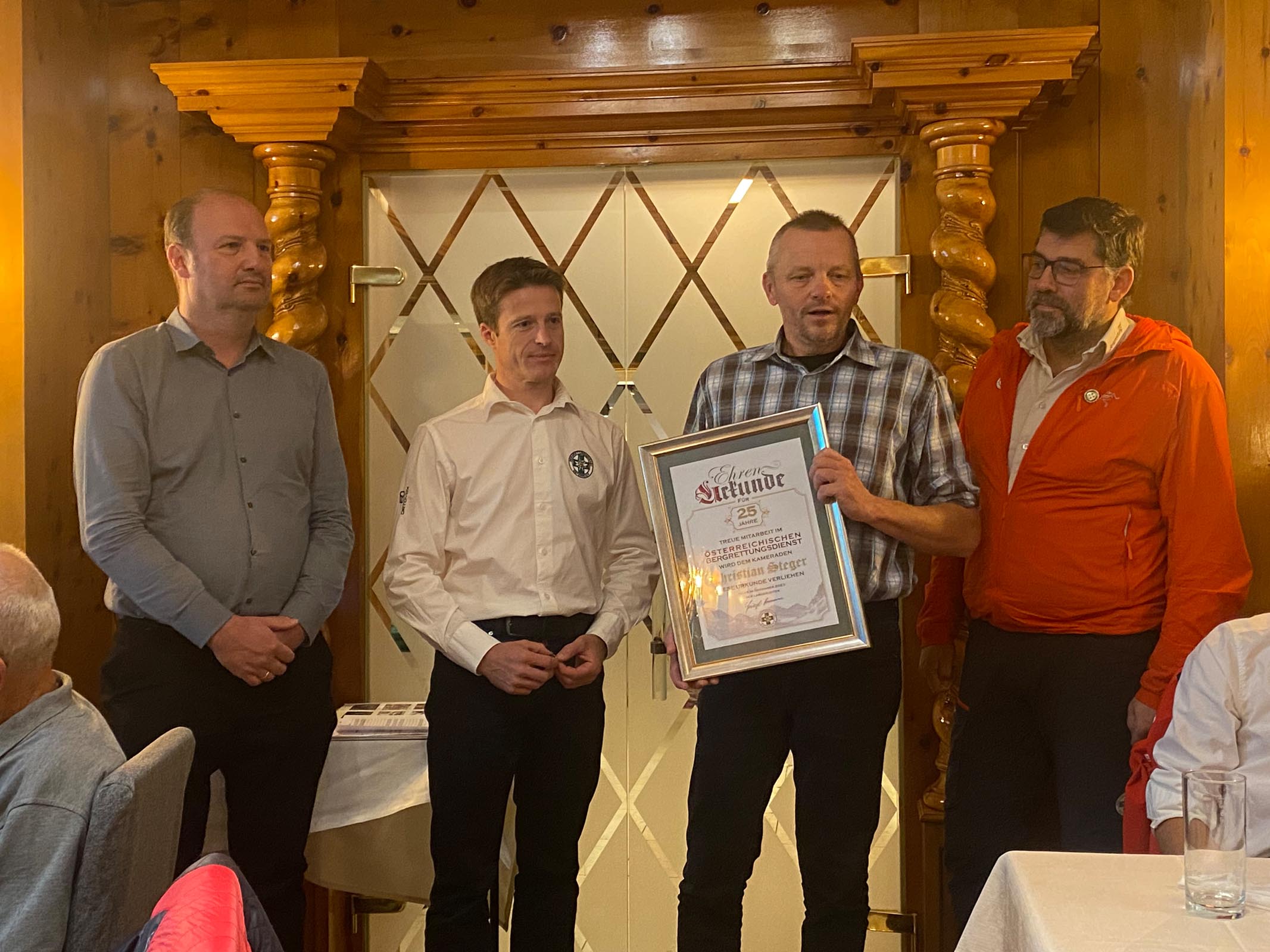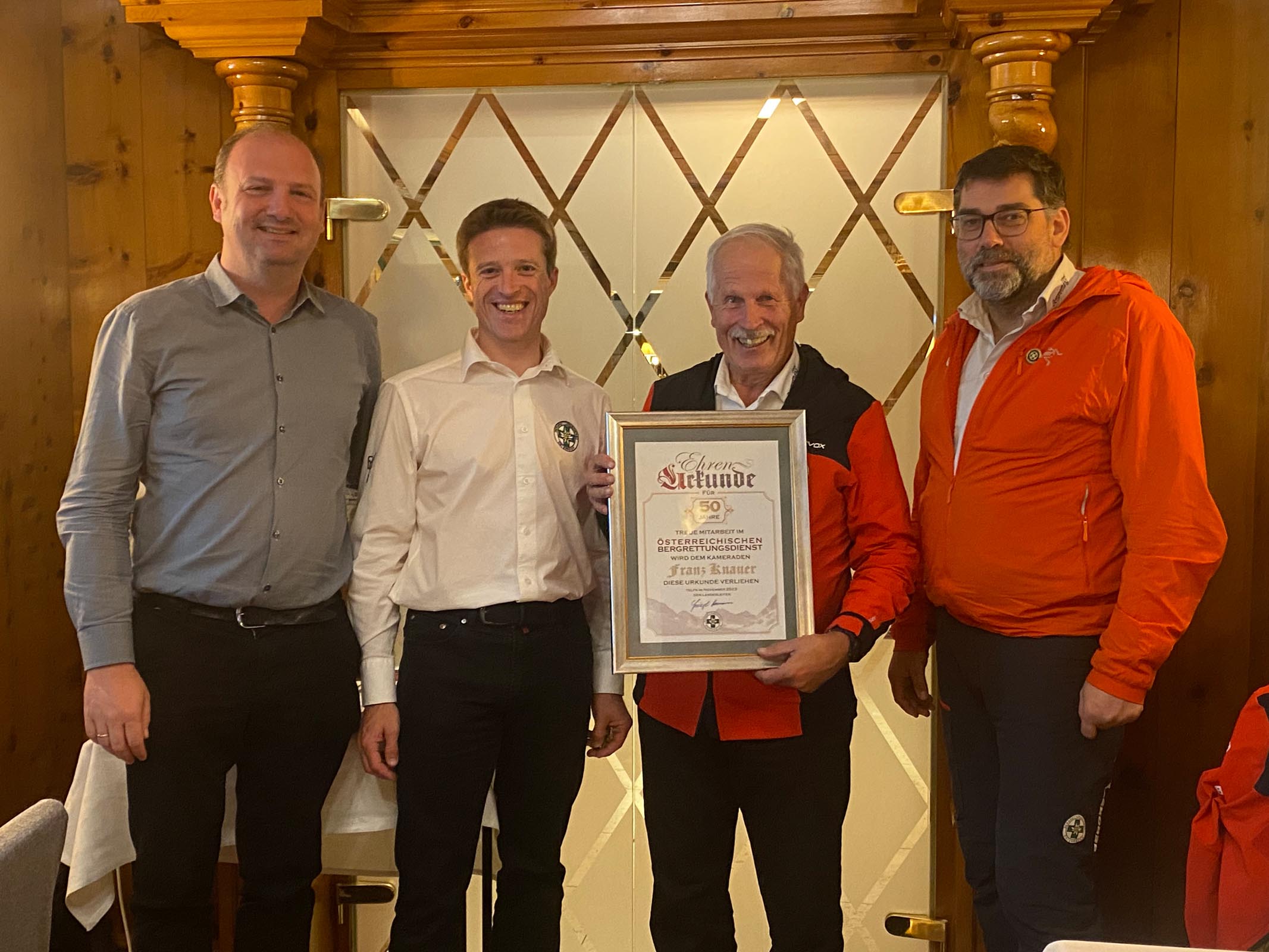 Eine besondere Ehrung wurde im Rahmen der diesjährigen Vollversammlung Franz Knauer zuteil. Für 50 Jahre treue Mitarbeit im Österreichischen Bergrettungsdienst überreichte ihm Orsstellenleiter Andreas Eder die Ehrenurkunde und dankte ihm für seinen unermüdlichen Einsatz für „seine“ Bergrettung. Bürgermeister Hans Jörg Moigg und Bezirksleiter Ulli Huber stellten sich als erste Gratulanten ein und wünschten dem Jubilar alles, alles Gute und noch viele gemeinsame Jahre im Kreise seiner Bergkameraden. Die Ehrenurkunde für 25 Jahre Mitgliedschaft konnte an diesem Abend Christian Steger entgegen nehmen. Ein herzlicher Dank an dieser Stelle beiden Jubilaren für ihre uneigennützige und vorbildliche jahrelange Mitarbeit.