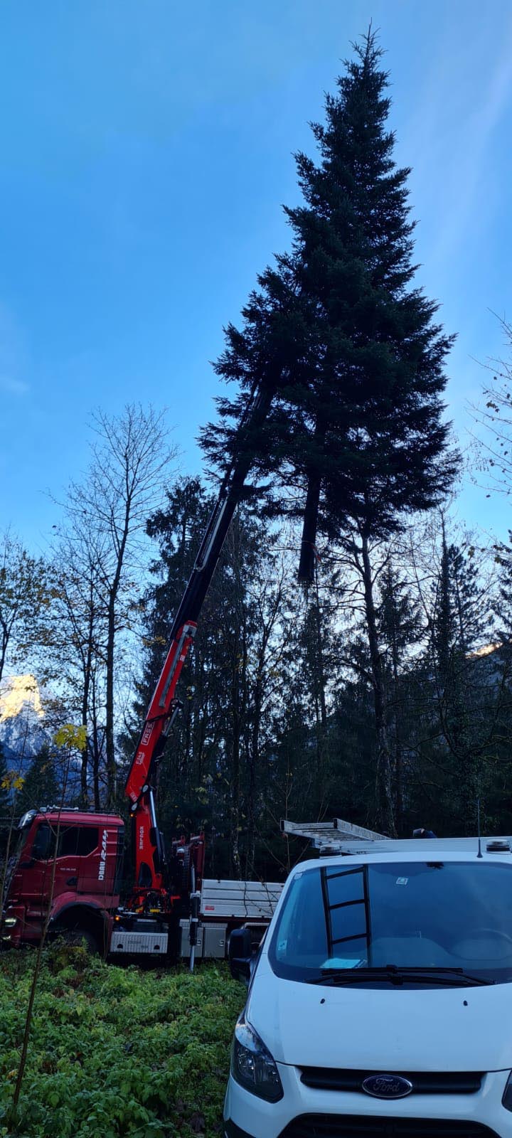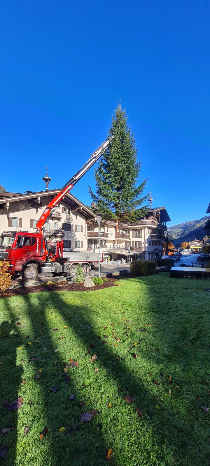 Rechtzeitig bevor die ersten Advent- und Weihnachtsmärkte ihre Pforten öffnen fanden auch in Mayrhofen zwei stattliche Bäume ihren Weg vom dunklen Scheulingwald hinaus zum Kreisverkehr bei der Einfahrt Mitte und ein zweites Glanzstück in das Ortszentrum vor die Pfarrkirche Mayrhofen.