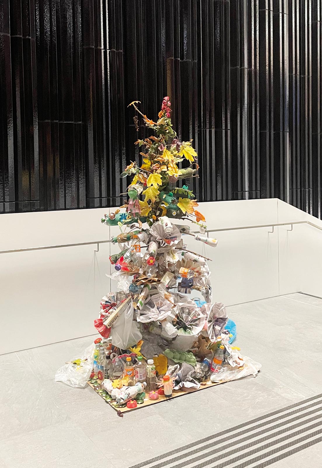 Mit ihrem Objekt „tersus sursum“ zeigen die 22 Schülerinnen und Schüler der Klasse 6G, wie sich die Natur Schritt für Schritt gegenüber dem von Menschen produzierten Abfall durchsetzen kann: Den Boden der Skulptur bildet eine Müllhalde. In der Mitte des Objekts nehmen die Wertstoffe organische Farben und Formen an –
