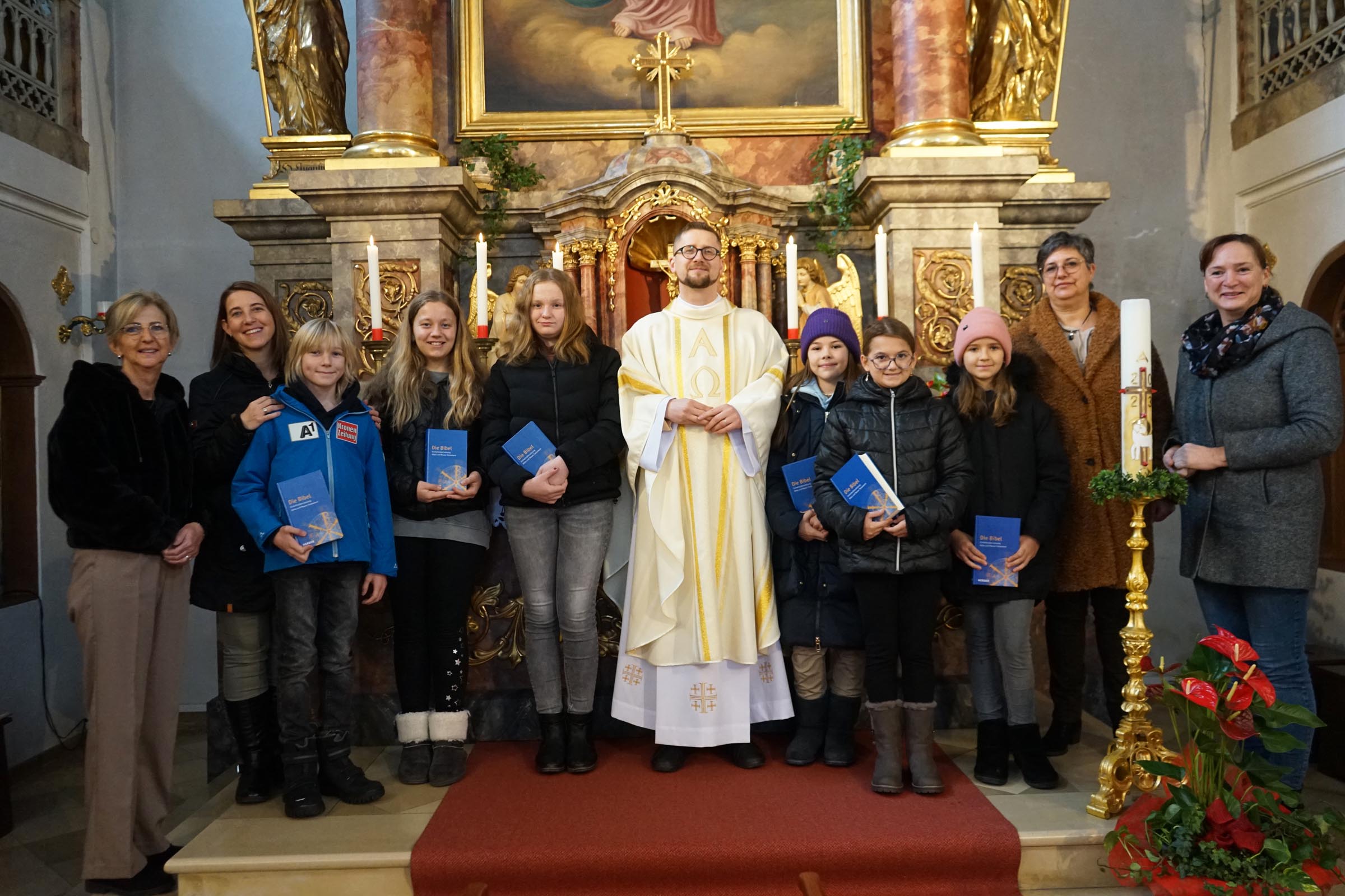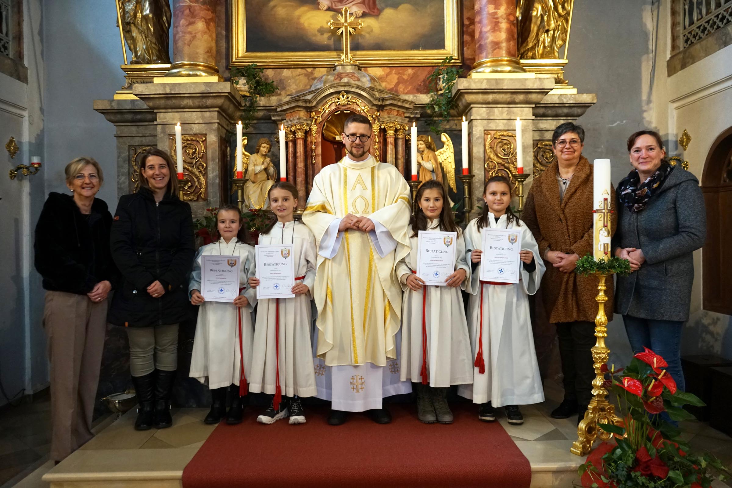 Vier neue Ministrantinnen haben sich in der Pfarre Aschau für den Dienst am Altar bereit erklärt. Am Christkönigssonntag wurden sie den Gottesdienstbesuchern vorgestellt und feierlich in ihr Amt eingeführt. Gleichzeitig wurden acht Ministrantlnnen verabschiedet und als Abschiedsgeschenk wurden ihnen eine Bibel überreicht.