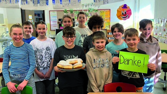 Ein herzliches „Dankeschön“ sagen die VolkssschülerInnen der Gemeinde für die leckeren Krapfen aus der Bäckerei Strasser.