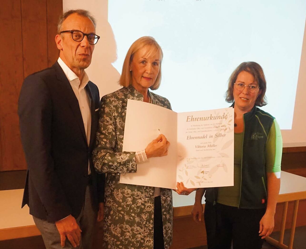 Bei der letzten Generalversammlung des Obst- und Gartenbauvereines Fügen hat Ehrenobfrau Viktoria Müller die „Silberne Ehrennadel“ für ihre Dienste vom Landesverband verliehen und vom Bezirksobmann Michael Tauber übergeben bekommen. Der Vorstand gratuliert der Preisträgerin auf das Allerherzlichste.