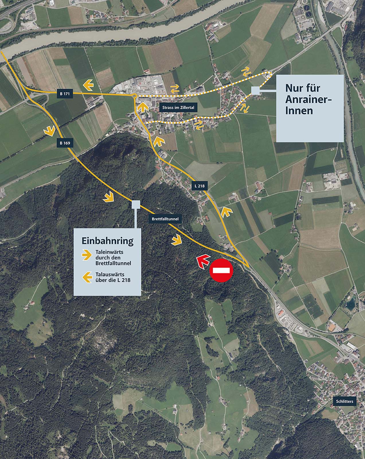 Von 8. April bis zum 21. Juni wird der Verkehr taleinwärts durch den Tunnel geführt. Talauswärts wird der Verkehr in Schlitters kurz vor dem Südportal des Brettfalltunnels auf die L 218 Rotholzer Straße ausgeleitet und über den Kreisverkehr in Strass in die