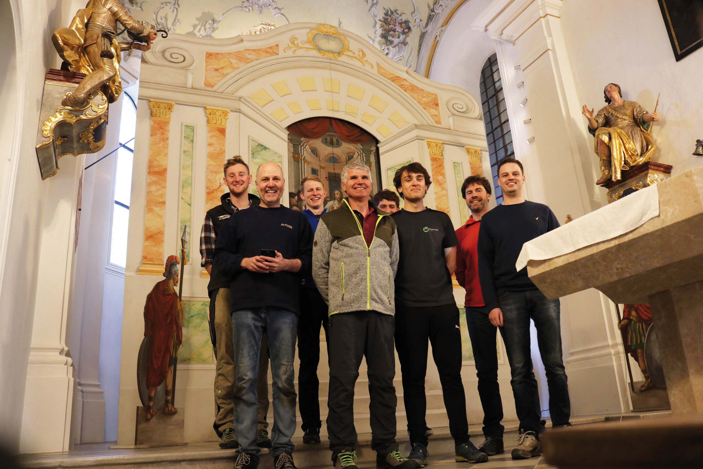 Die Schützenkompanie Stumm/Stummerberg dankt den kletterfreudigen und schwindelfreien Kameraden: Maximilian, Gerhard, Manuel, Andreas, Lorenz, Jakob, Manfred und Patrik – nicht auf Bild Markus Als und Daniel Siegele (auch für Gerüst) für ihren Einsatz beim Aufstellen des Ostergrabes.