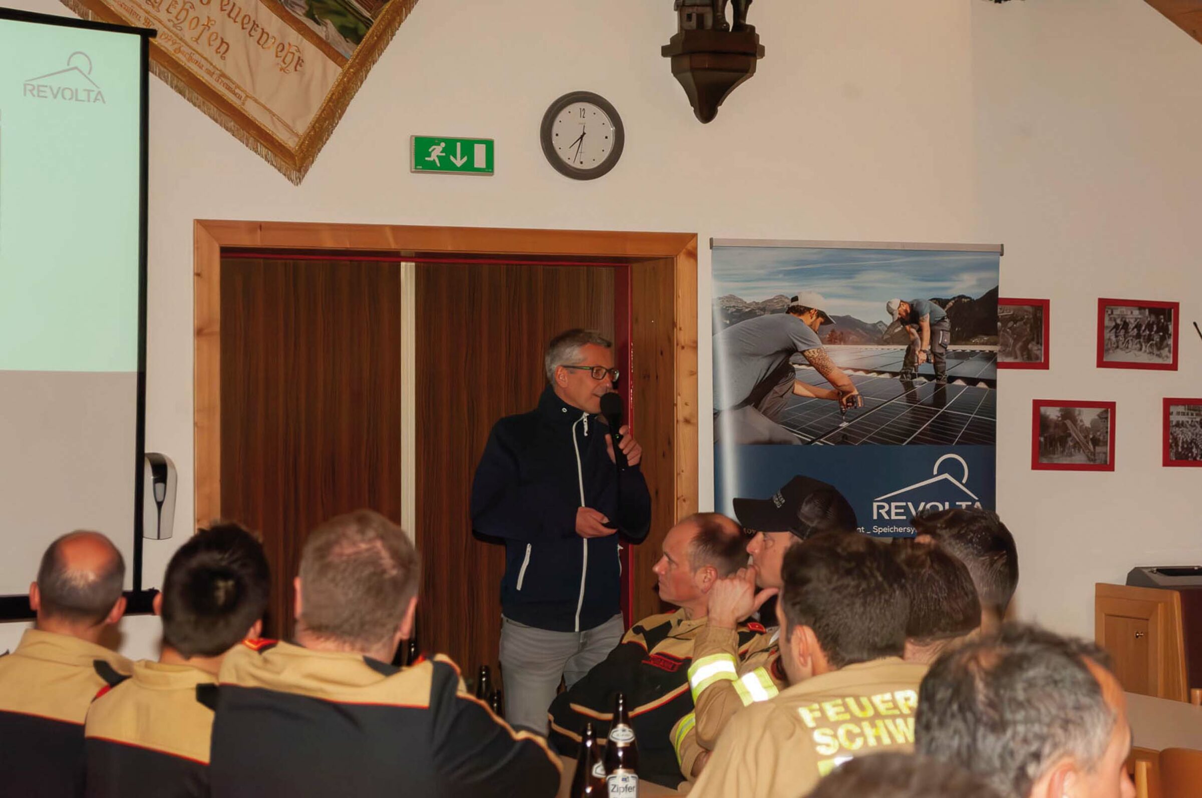 Zu diesem Anlass kam Ing. Dipl.Wirt.Ing. (FH) Bernhard „Ben“ Schmidt der Firma Revolta nach Mayrhofen ins Feuerwehrgerätehaus. Der Vortrag richtete sich an alle Führungskräfte der Feuerwehren des Abschnittes Mayrhofen. Es wurde auf die Gefahren beim Feuerwehreinsatz bei Gebäuden mit Photovoltaik-Anlagen hingewiesen. Ben Schmidt erklärte den interessierten Kameraden alles Notwendige, was es über PV-Anlagen zu wissen gibt, über Vorgehensweisen und Gefahren, über die Unterschiede zwischen privaten und gewerblich genutzten Anlagen.