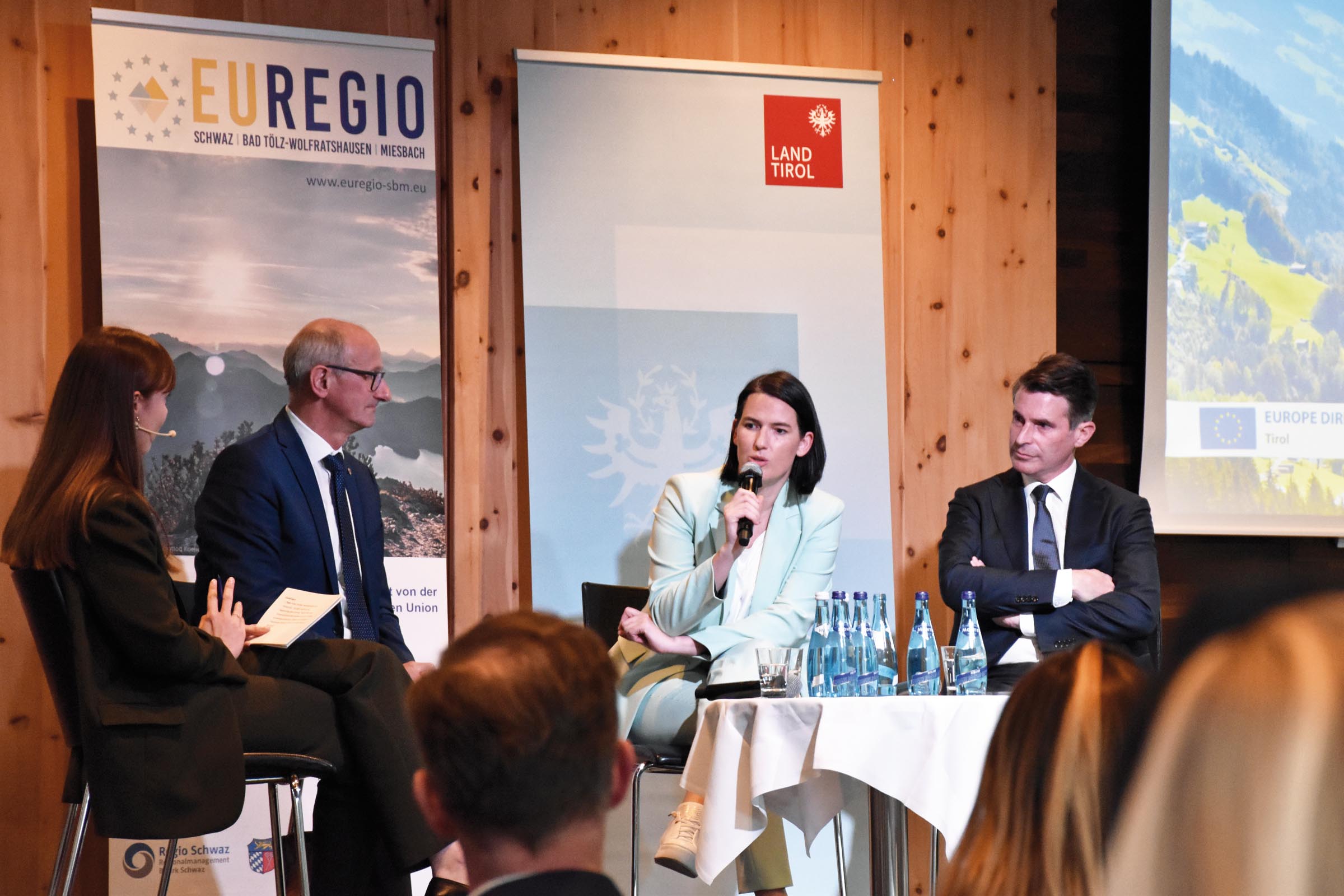 Die Podiumsdiskussion mit LH Anton Mattle, die Abgeordnete zum Europäischen Parlament, Barbara Thaler und der bayerische Staatsminister Eric Beißwenger. Fotos: Land Tirol/Pölzl