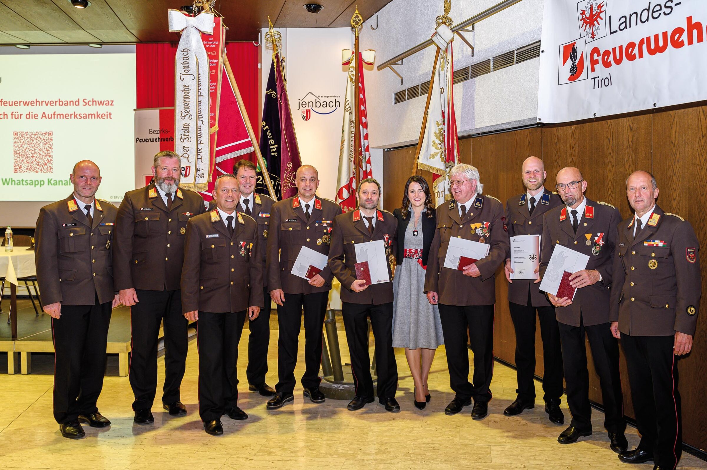 Mit dem Verdienstzeichen des Landesfeuerwehrverbandes Tirol Stufe IV in Bronze wurden ausgezeichnet: OBI Roland Klocker – FF-Aschau i. Zillertal, HV Walter Mühlegger – FF-Achenkirch, HBI Alexander Stock – FF-Zell a. Ziller, OBI Hubert Wallner – FF-Gallzein