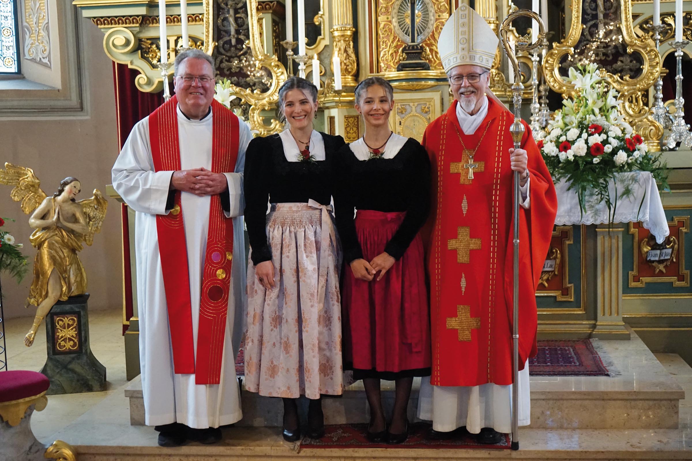 irmling Sarah mit Patin Nina, Firmspender Abt German Erd und Pfarrer Erwin Gerst.