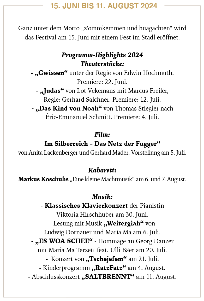 Das Kulturfestival „stummer schrei“ feiert 2024 sein 20-jähriges Jubiläum. Begonnen mit einer Vision, ist das Festival mittlerweile ein Fixpunkt des kulturellen Lebens im Zillertal mit abwechslungsreichem Programm. Im Jubiläumsjahr dreht sich alles um Volkstheater und Volksmusik.