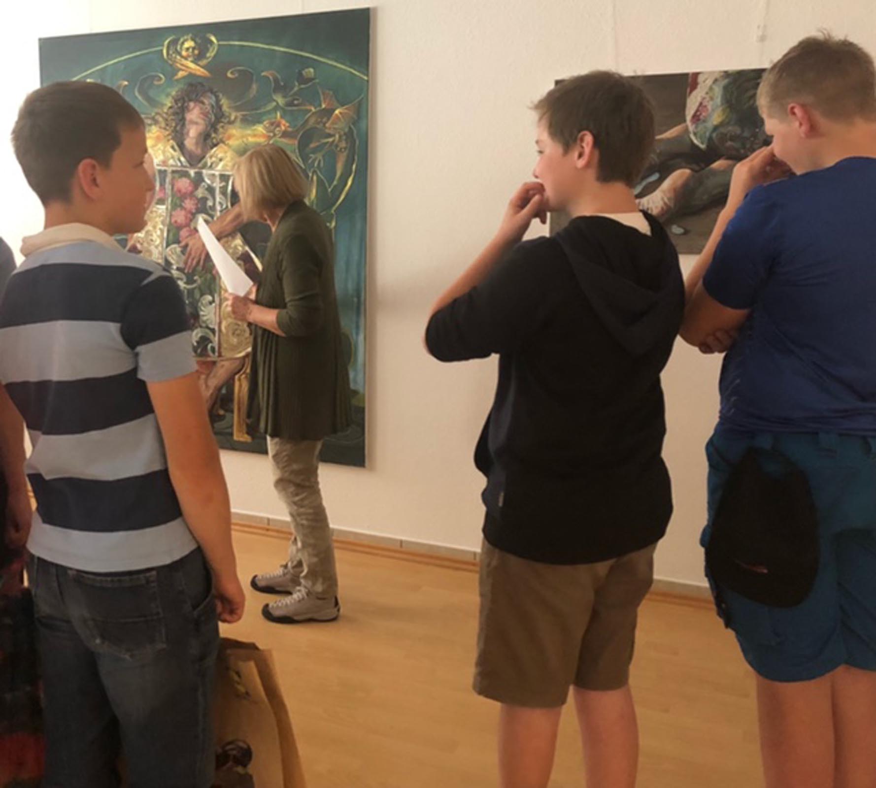 Mag.Arch. Helga Madera, die Gründerin und Leiterin der Galerie vermittelte kunstgeschichtliche Grundlagen zur surrealistischen Malerei mit Bildbeispielen und führte anschließend durch die Räume der Galerie. Die Kunstwerke von Susanne Liner faszinierten die jungen Besucher und regten sie zu zahlreichen Fragen an. Beim Betrachten der Bilder wurde über das Gesehene gesprochen und Fragen beantwortet, die die Kinder beschäftigten.