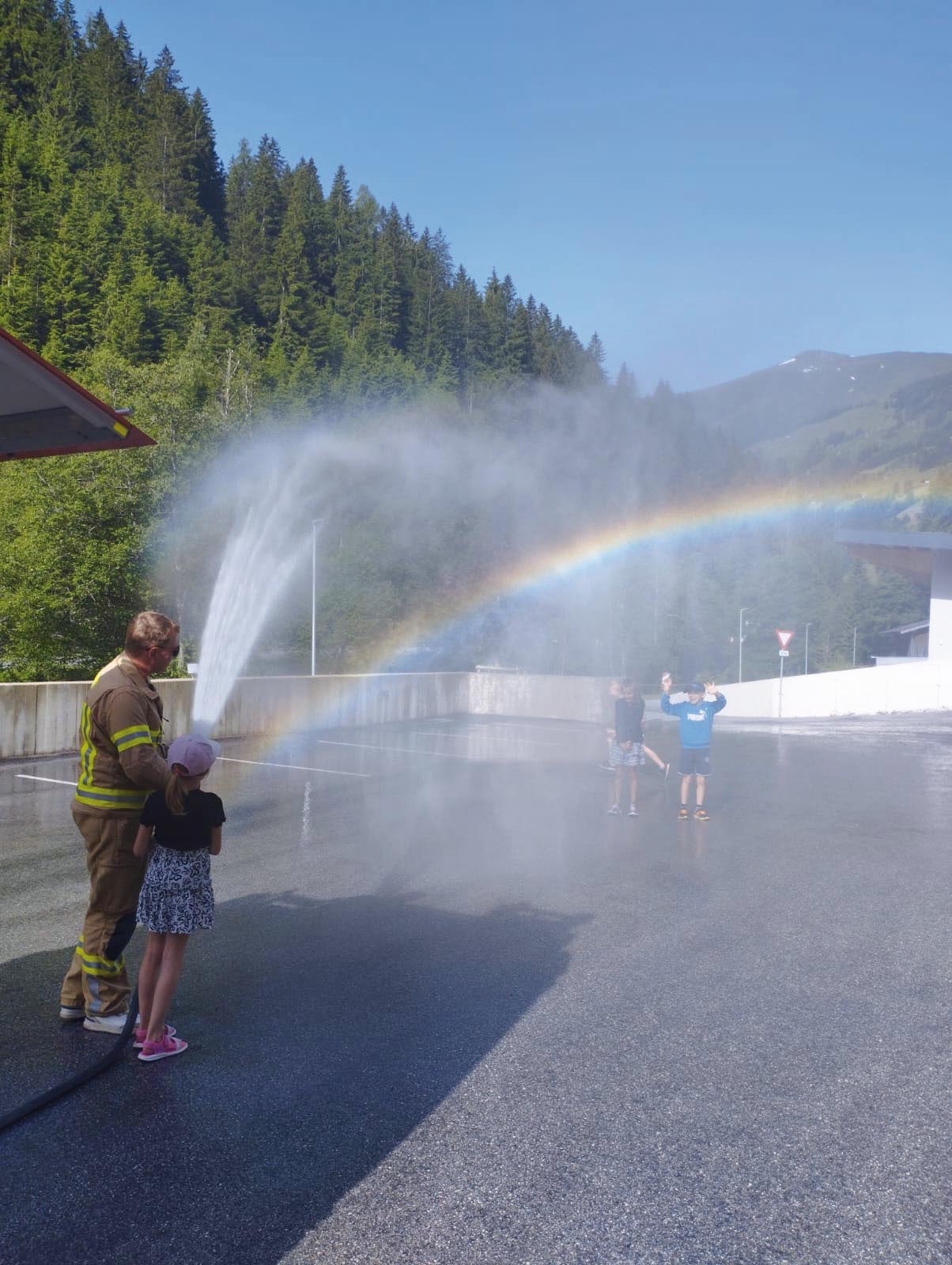 Die Freiwillige Feuerwehr holte uns dafür mit dem großen Tankwagen und zwei weiteren Einsatzfahrzeugen in der Schule ab, was die Kinderaugen bereits zum Strahlen brachte. Im Einsatzzentrum angekommen, wurden wir durch die Räumlichkeiten der Feuerwehr geführt und konnten alles ganz genau unter die Lupe nehmen. Die schweren Helme der Kommandanten waren dann doch noch ein wenig zu groß für uns. Die Feuerwehrmänner und -frauen haben uns viele spannende Details erklärt und Fragen beantwortet. Ein großes Highlight war die Fahrt mit der Drehleiter, die nasse Abkühlung an diesem warmen Sommertag und die kleine Stärkung.