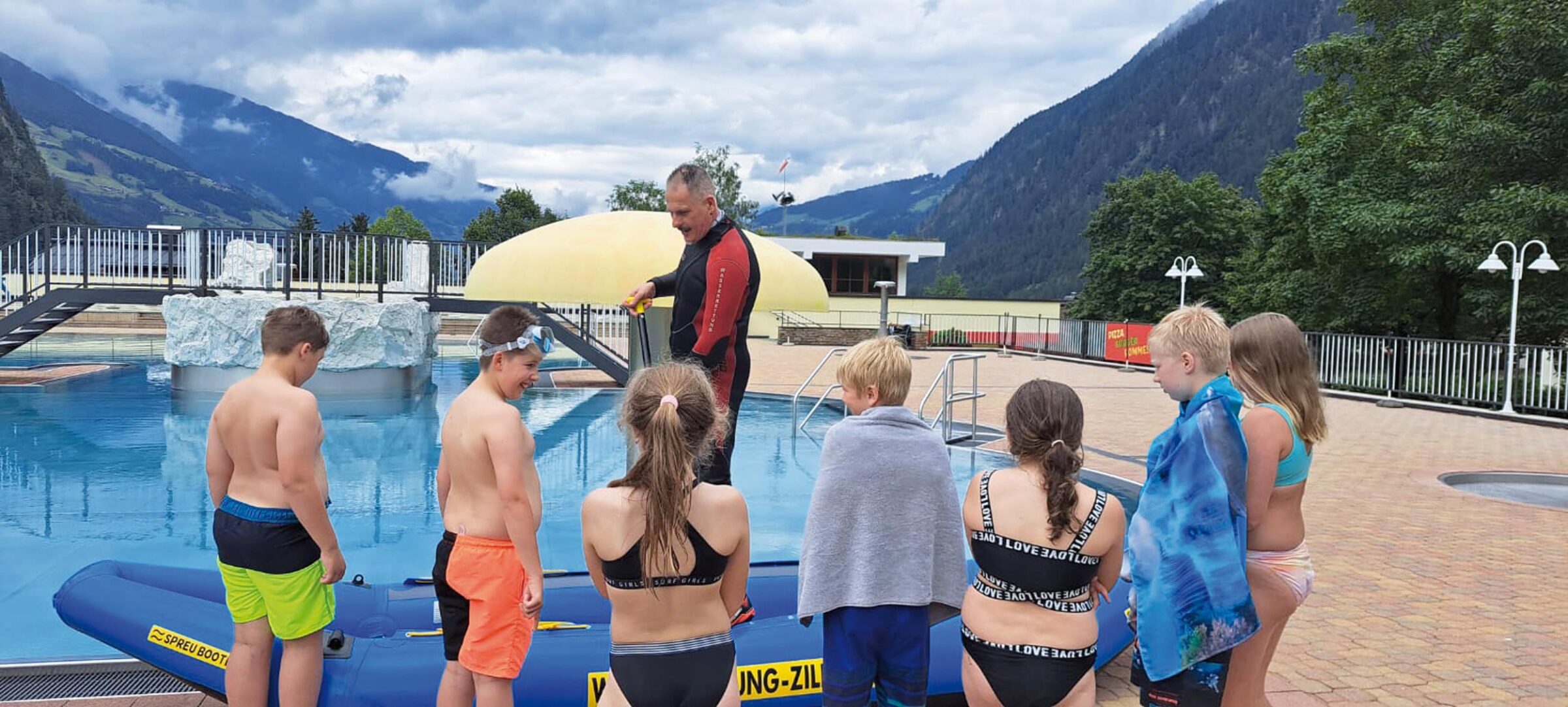 Ein weiterer besonderer Programmpunkt stand am Dienstag Nachmittag an: Die Wasserrettung stattete uns einen Besuch ab, um den Schüler/innen den richtigen Umgang mit Wassernotfällen näherzubringen. Christina, Uschi und Bernhard von der Mayrhofner Wasserrettung demonstrierten, wie die Rettung einer Person aus einer Notlage aussieht. Außerdem durften die Schüler/innen die Ausrüstung der Wasserrettung auch selbst ausprobieren und sich darin versuchen, ein Übungsboot gezielt durchs Wasser zu lenken.