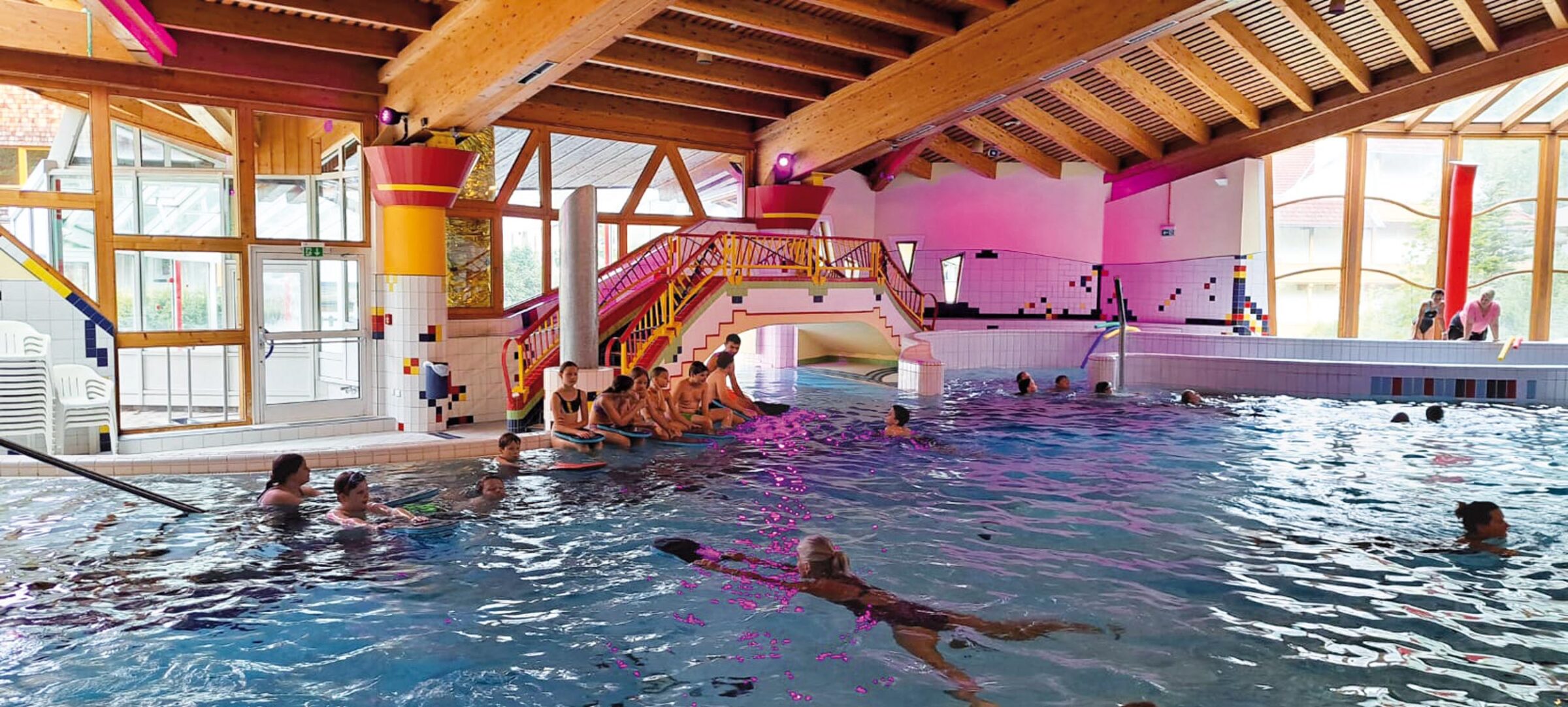 Natürlich kam auch der Spaß nicht zu kurz – in den Pausen vor und nach den Schwimmeinheiten verbrachten die Schüler/innen jede freie Minute auf den Wasserrutschen und stärkten ihren Zusammenhalt als Klasse.