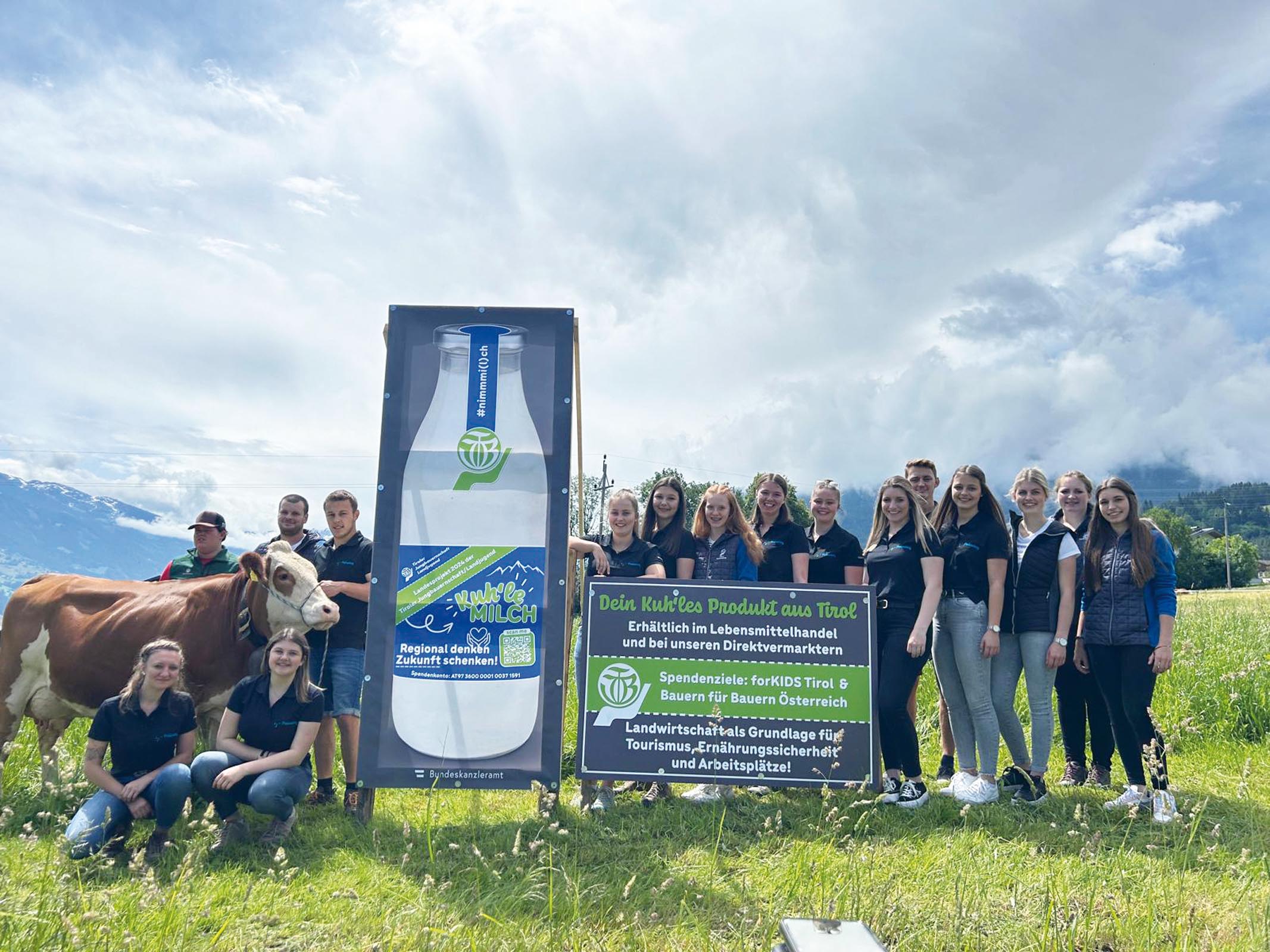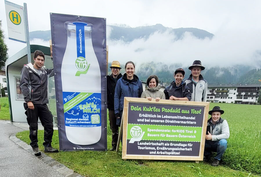 Info-Tafeln und Transparente machen im gesamten Bezirk Schwaz im Juni und Juli auf die Bedeutung heimsicher Lebensmittel aufmerksam. Parallel dazu erstrahlen die Glasflaschen der Tirol Milch in ganz Österreich in einem speziellen Design der Tiroler Jungbauernschaft/Landjugend. Jede dieser Milchflaschen trägt einen QR-Code, der es ermöglicht, direkt für wohltätige Zwecke zu spenden. Wer keine Möglichkeit hat, über den Code zu spenden, für den ist auch ein IBAN des TJB/LJ-Spendenkontos hinterlegt. Die gesammelten Spenden fließen in zwei Projekte: „forKIDSTirol“, das sich für benachteiligte Kinder in der Region einsetzt, und „Bauern für Bauern Österreich“, eine Initiative zur Unterstützung von landwirtschaftlichen Familien in Not.
