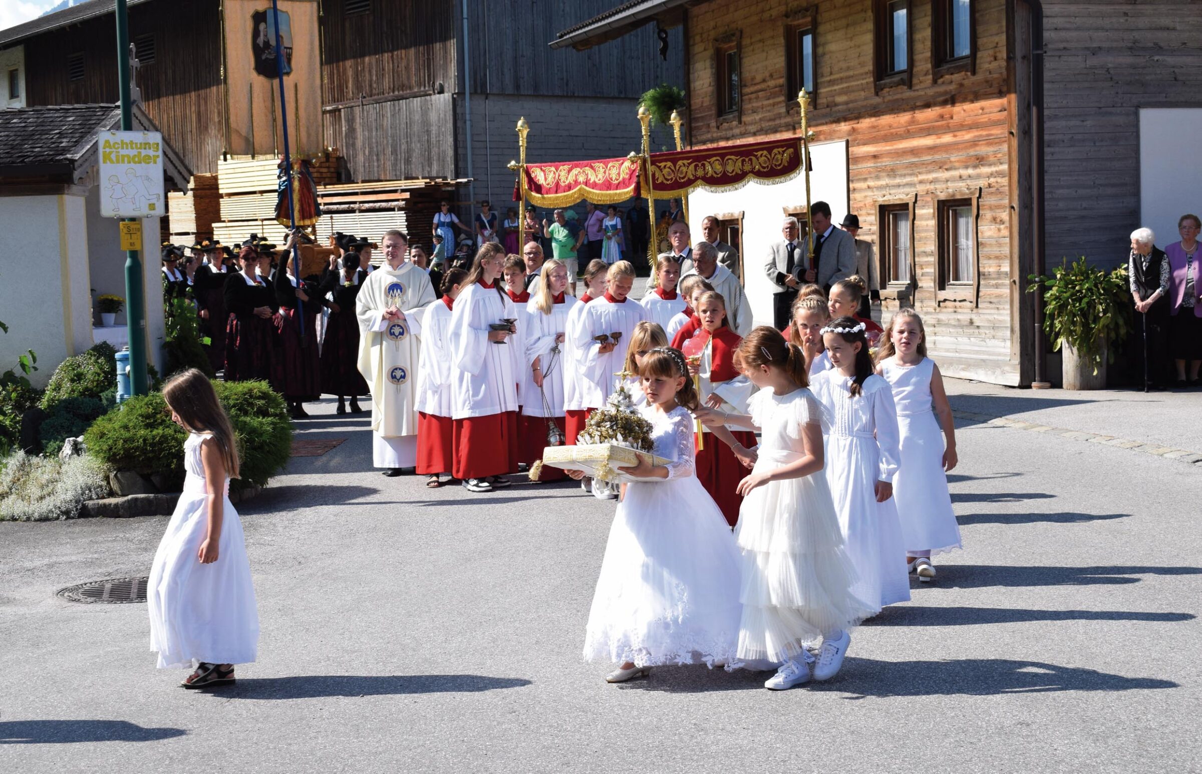 Weihbischof Dr. Hansjörg Hofer aus Salzburg verbringt wie jedes Jahr den Urlaub in seiner Heimatgemeinde. Erfreulicherweise übernimmt er in dieser Zeit die kirchlichen Aufgaben, um unseren Herrn Pfarrer zu entlasten. So trug er das Allerheiligste durch unser Dorf bis in die März. Die Prozessionsordnung wurde vor kurzem etwas überarbeitet und konnte somit das erste Mal ausprobiert werden. Es ist immer ein herrliches Bild, wenn ein großer Teil der Pfarrgemeinde bei der Prozession mitwirkt und dadurch auch ihren Glauben bezeugt. Den Abschluss des Festtages bildeten in gewohnter Weise die Ehrensalven der Schützen für den Weihbischof und die Bürgermeister. Zum gemütlichen Ausklang traf man sich im schönen Gastgarten des Landgasthofes Linde.