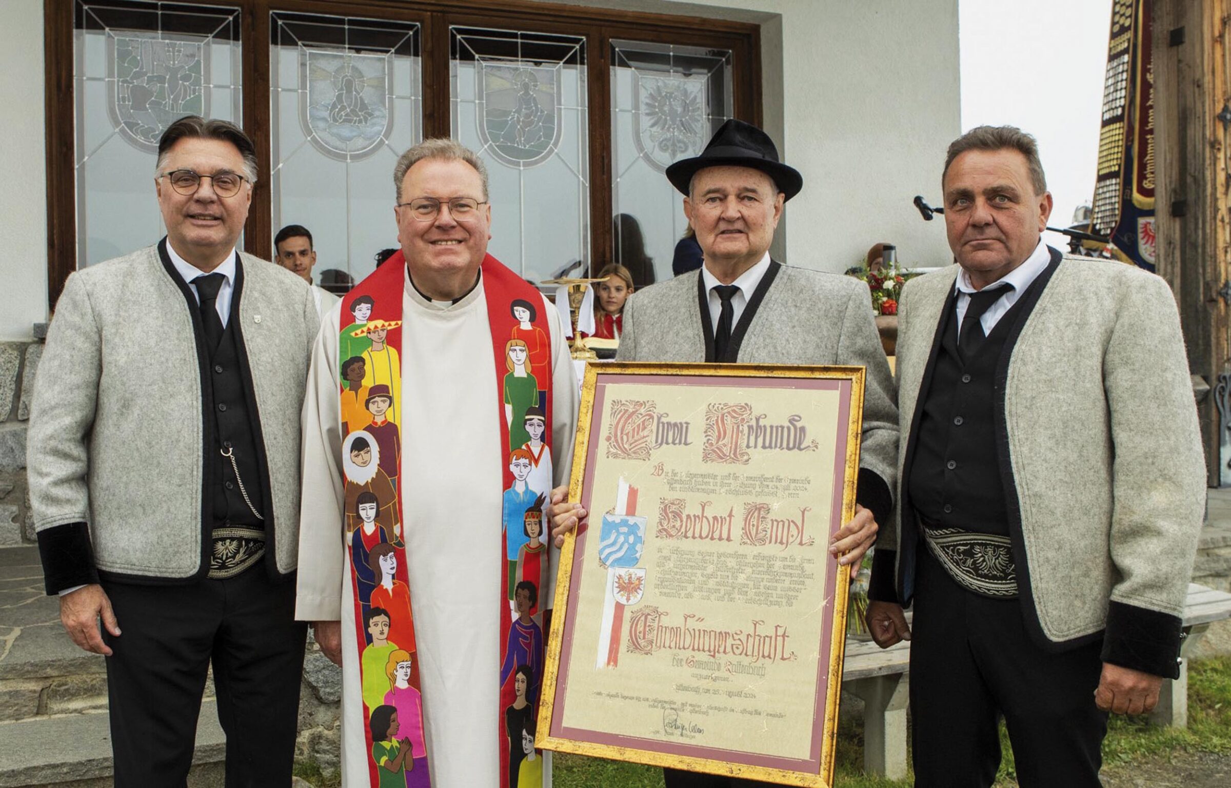 Besondere Ehre wurde dem Wirtschafts- und Fahrzeugpionier Herbert Empl zuteil. Er erhielt die höchste Auszeichnung der Gemeinde Kaltenbach, die Ehrenbürgerschaft in Form der Ehrenbürgerurkunde aus den Händen des Bürgermeisters! Nicht nur wegen seines Gespürs für Entwicklungen und Technik – sondern besonders auch für seine vielen sozialen Engagements, wie der Bürgermeister in der Laudatio festhielt. Bürgermeister Klaus Gasteiger samt Gemeinderat, Bundesmusikkapelle, Schützenkompanie, Jägerschaft, Feuerwehr, Bergrettung und zahlreiche anderer Vereinsfunktionäre waren anwesend.