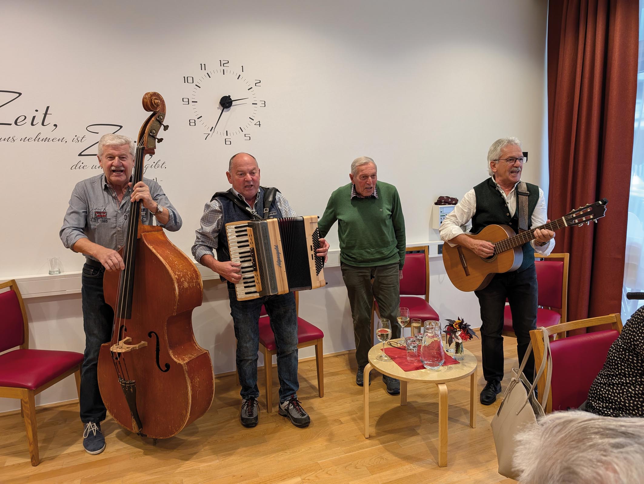 Die Jubilare wurden nicht nur mit kulinarischen Köstlichkeiten verwöhnt, sondern auch mit einem persönlichen Präsent überrascht – ein kleines Zeichen der Wertschätzung, das für viele strahlende Gesichter sorgte. Für die musikalische Umrahmung sorgte das bekannte Musikurgestein “Schwarzenstein Koral” gemeinsam mit seinen treuen Musikfreunden Lois, Friedl und Franz. Ihre Klänge sorgten für eine ausgelassene Stimmung und luden die Gäste zum Mitsingen und Mitklatschen ein. Ein rundum gelungener Nachmittag, der noch lange in Erinnerung bleiben wird! Die Hausleitung möchte sich herzlich bei Hanni Eberl und der gesamten Kegelrunde Finkenberg sowie bei den Musikern bedanken. Mit ihrem Engagement und ihrer Herzlichkeit haben sie den Bewohnerinnen und Bewohnern einige schöne Stunden beschert.