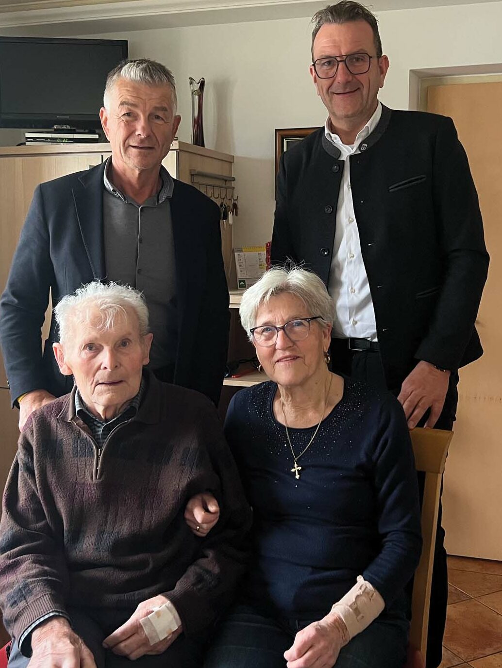 Zum Ende des Jahres 2024 konnte Bgm. Alexander Tipotsch gemeinsam mit Bezirkshauptmann-Stv. Dr. Wolfgang Löderle die Jubelgaben des Landes Tirol an zwei Ehepaare überreichen. Diese lieb gewordenene Tradition erfuhren die Ehegatten Dengg Gottfried und Frieda, Laimach 107, zu ihrer Diamantenen Hochzeit sowie die Ehegatten Troppmair Josef und Margarethe, Afelden 151, zur Goldenen Hochzeit.