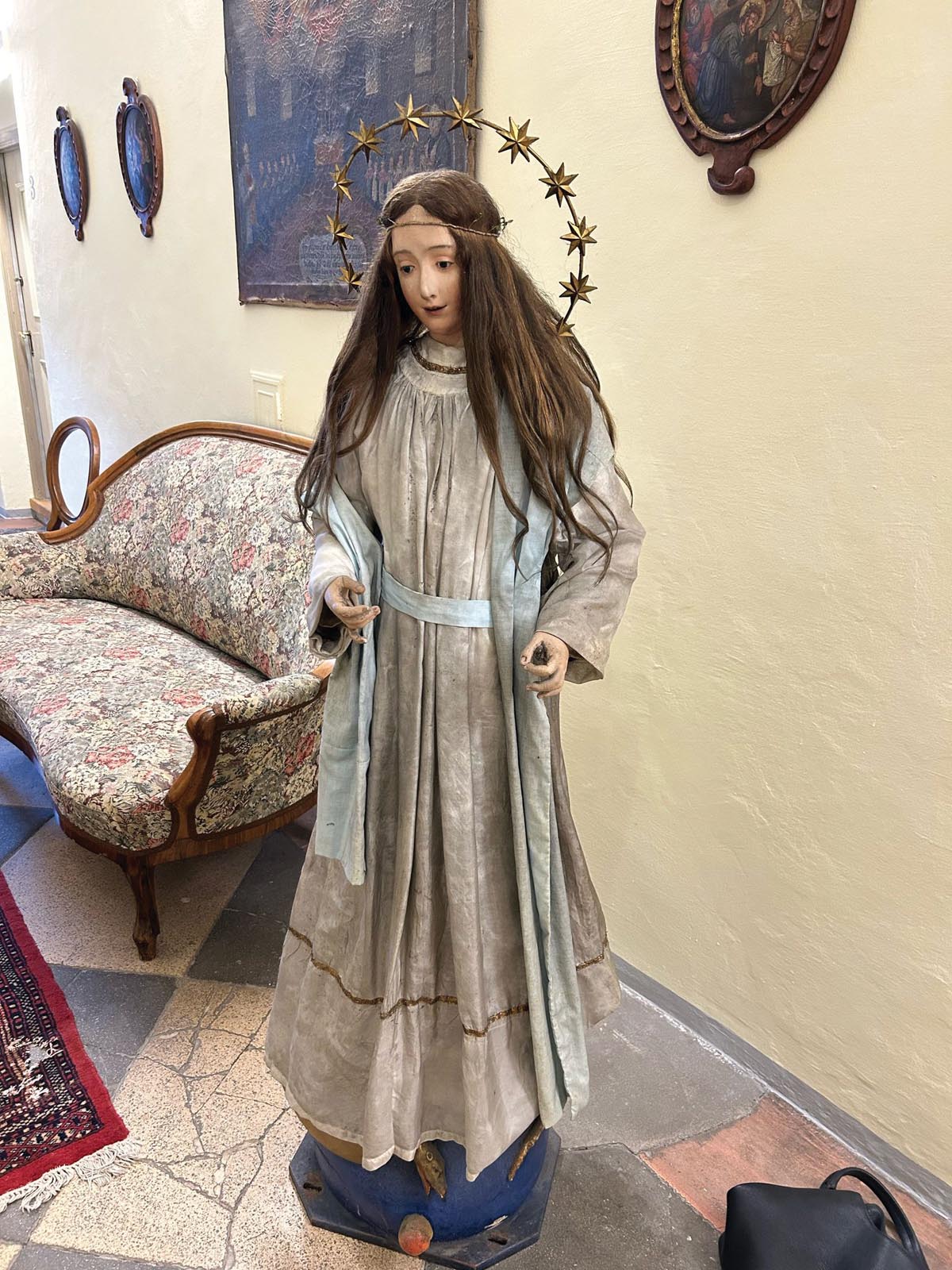 So hat er eine frühere  Prozessionsfigur der Jungfrau Maria vom Dachspeicher geholt. Eine Art große Gliederpuppe, bekleidet, mit geschnitztem Kopf und  Echthaar, geschnitzten Händen und Füßen –